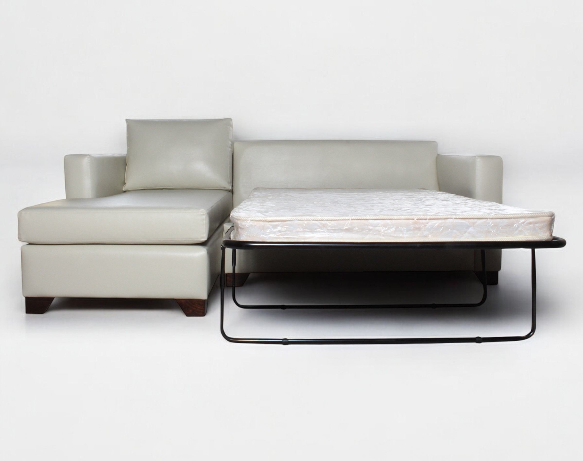 Sofá Cama Seccional 231 cm tapizado en Cuero Sintético Clean, material con atributos técnicos destacables, como resistencia al alto tráfico, facilidad de limpieza, propiedades ignífugas y antibacteriales. En su interior, el sofá esconde un colchón que se puede extender para convertirse en una cómoda cama de 1,5 plazas. Además, en el otro extremo, cuenta con un chaise longue izquierdo perfecto para recostarse. Ambas piezas están unidas mediante fijaciones metálicas, lo que facilita su manejo.