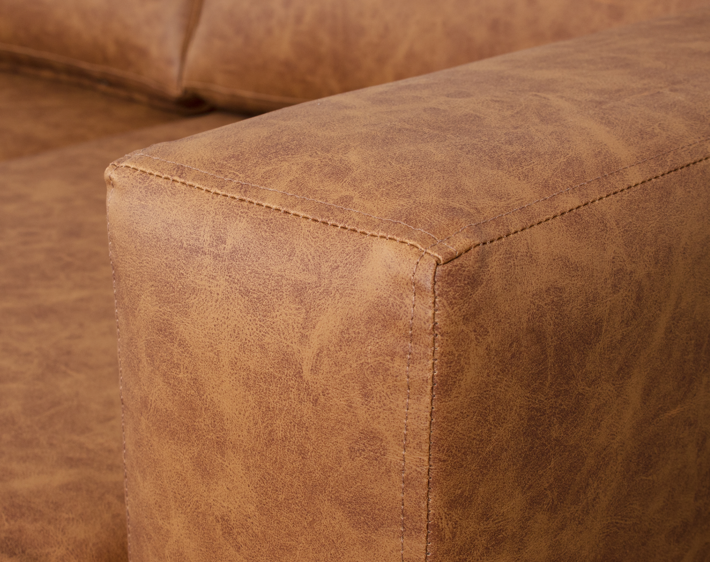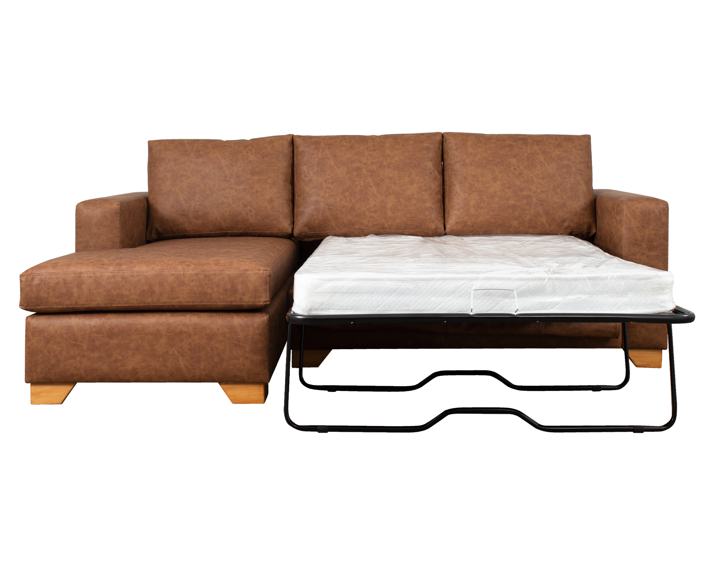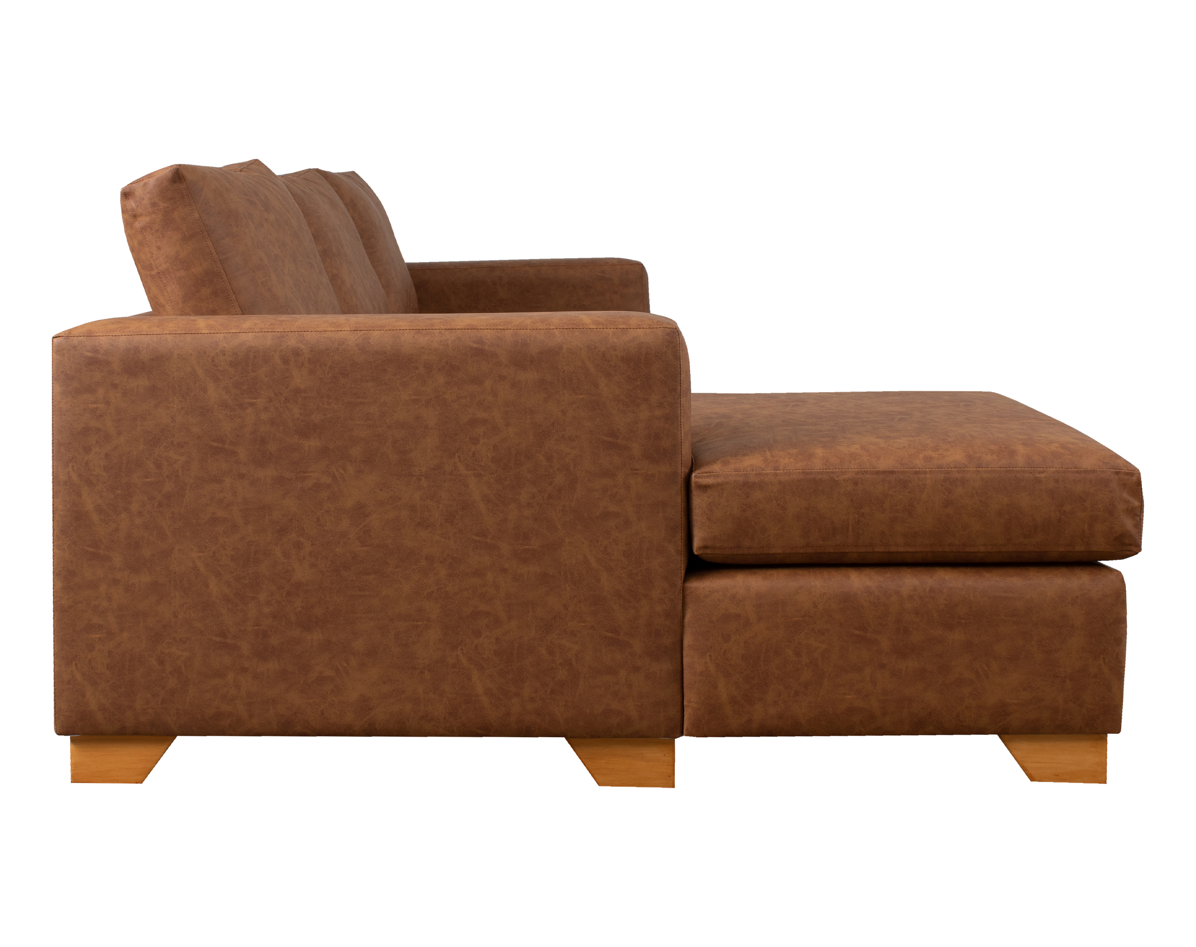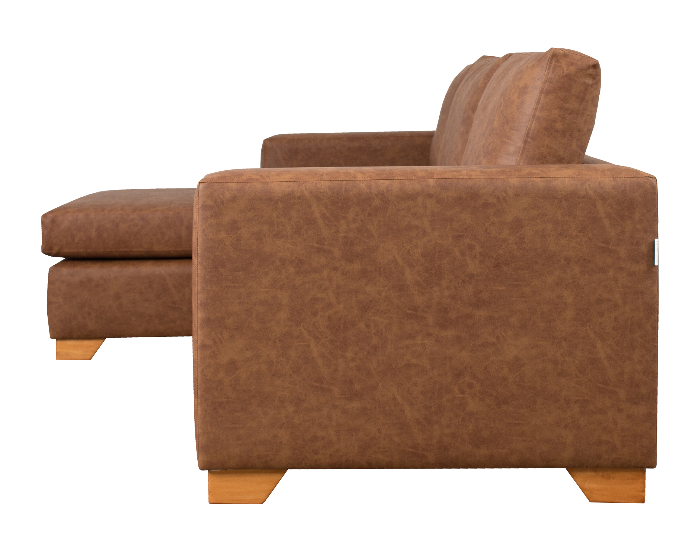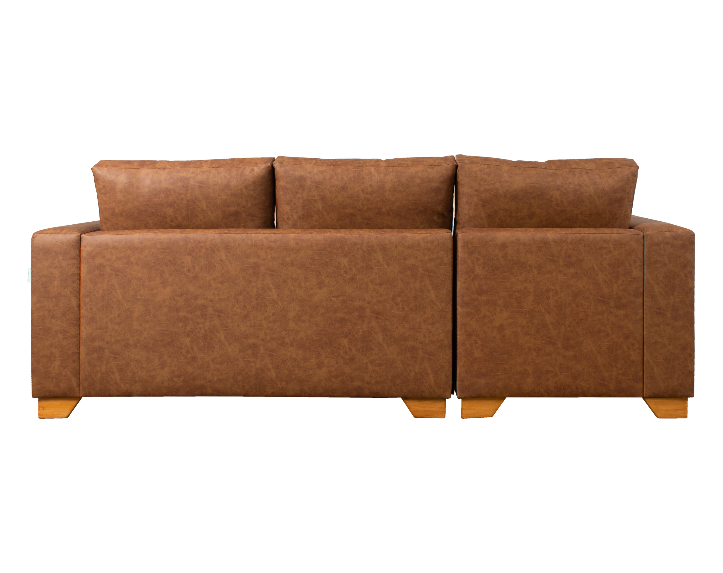 Imagen principal corresponde a Sofá Seccional Cama Izquierdo 1,5 Plazas modelo Urban tapiz Cuero Sintético Terra Pro color miel con patas de madera color miel corte ángulo de 7 cm.