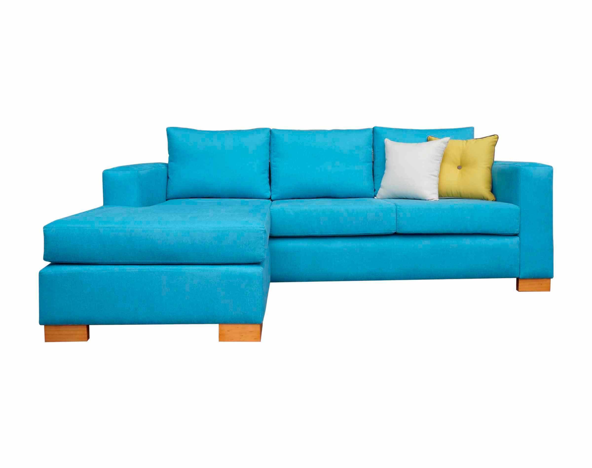 Fotografía corresponde a Sofá modelo Mónaco chaise longue intercambiable (izquierda o derecha) tapiz Calafate celeste con patas madera 7 cm miel corte recto.