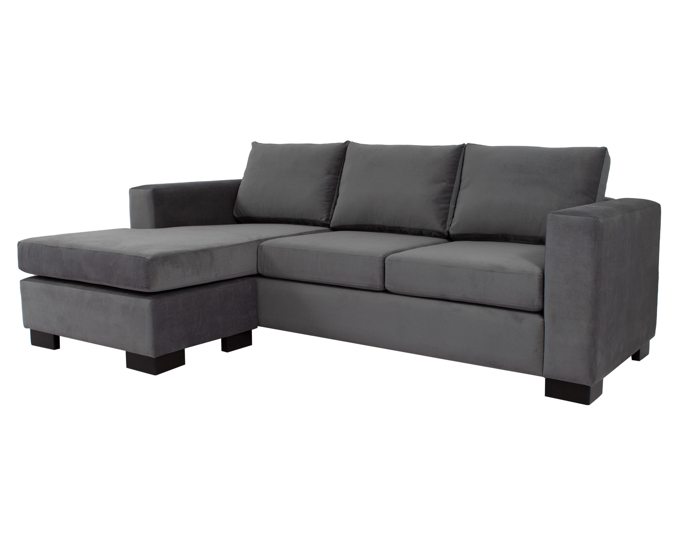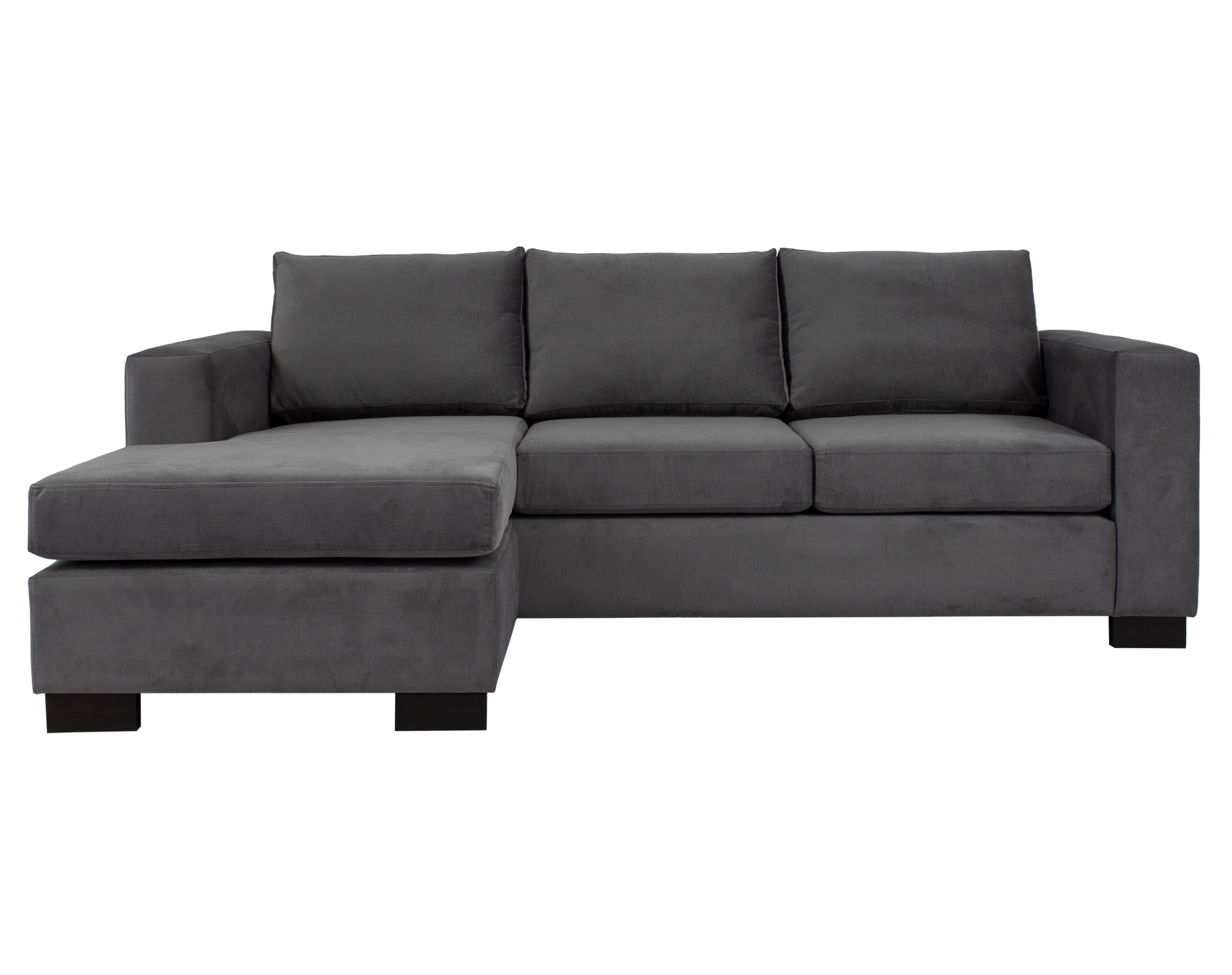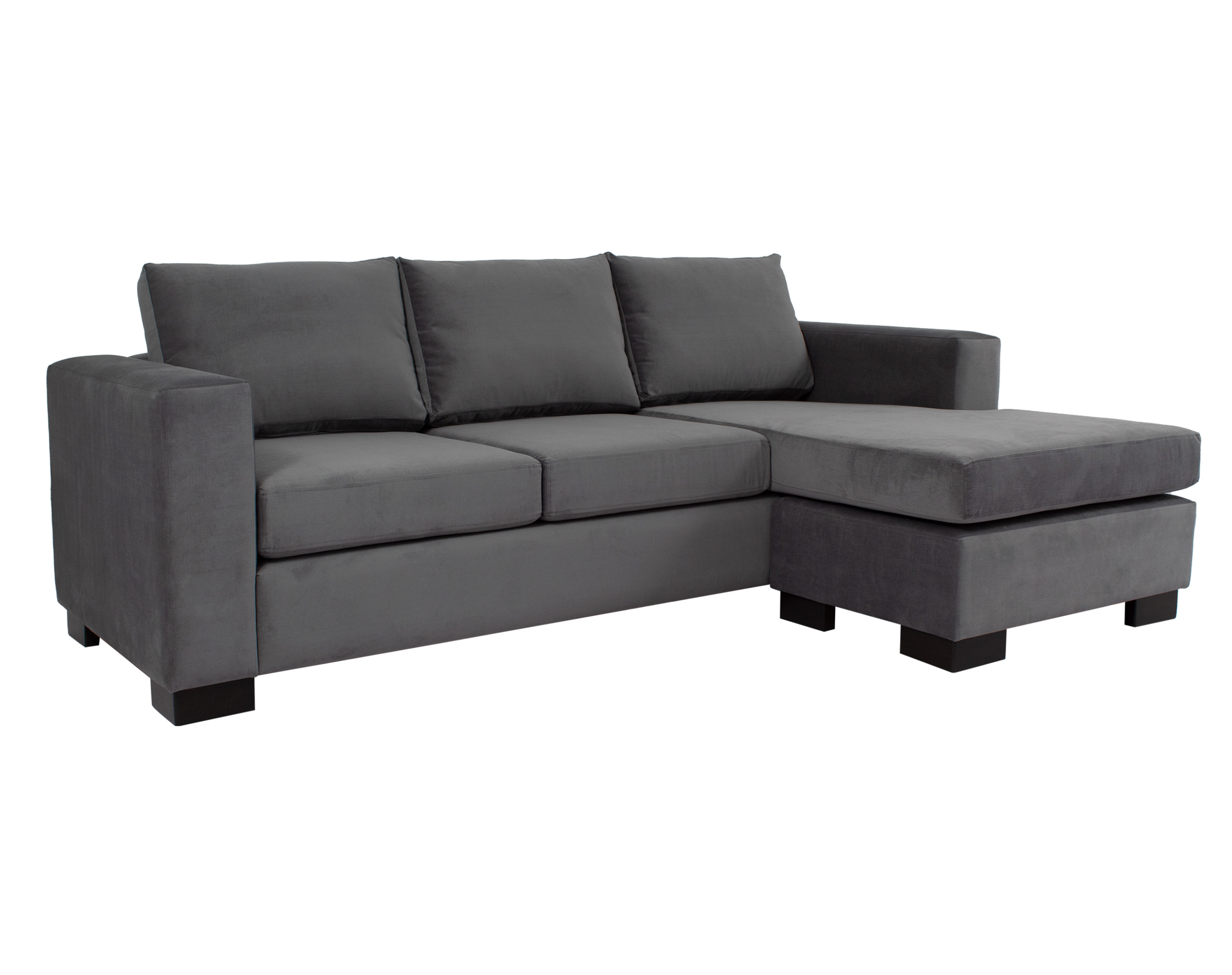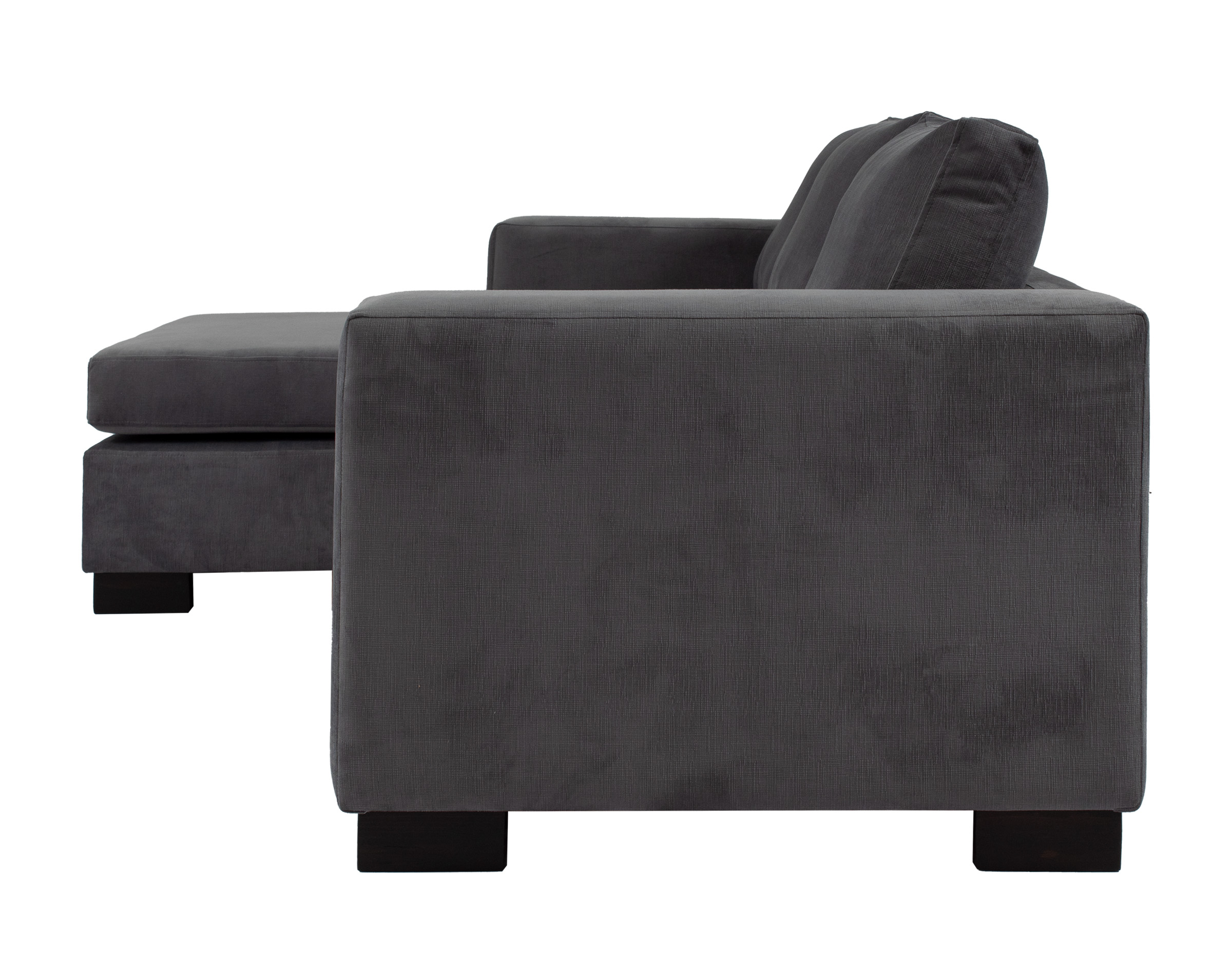 Fotografía corresponde a Sofá modelo Mónaco chaise longue intercambiable (izquierda o derecha) tapiz Felpa Grabado Gris con patas madera 7 cm grafito corte recto.