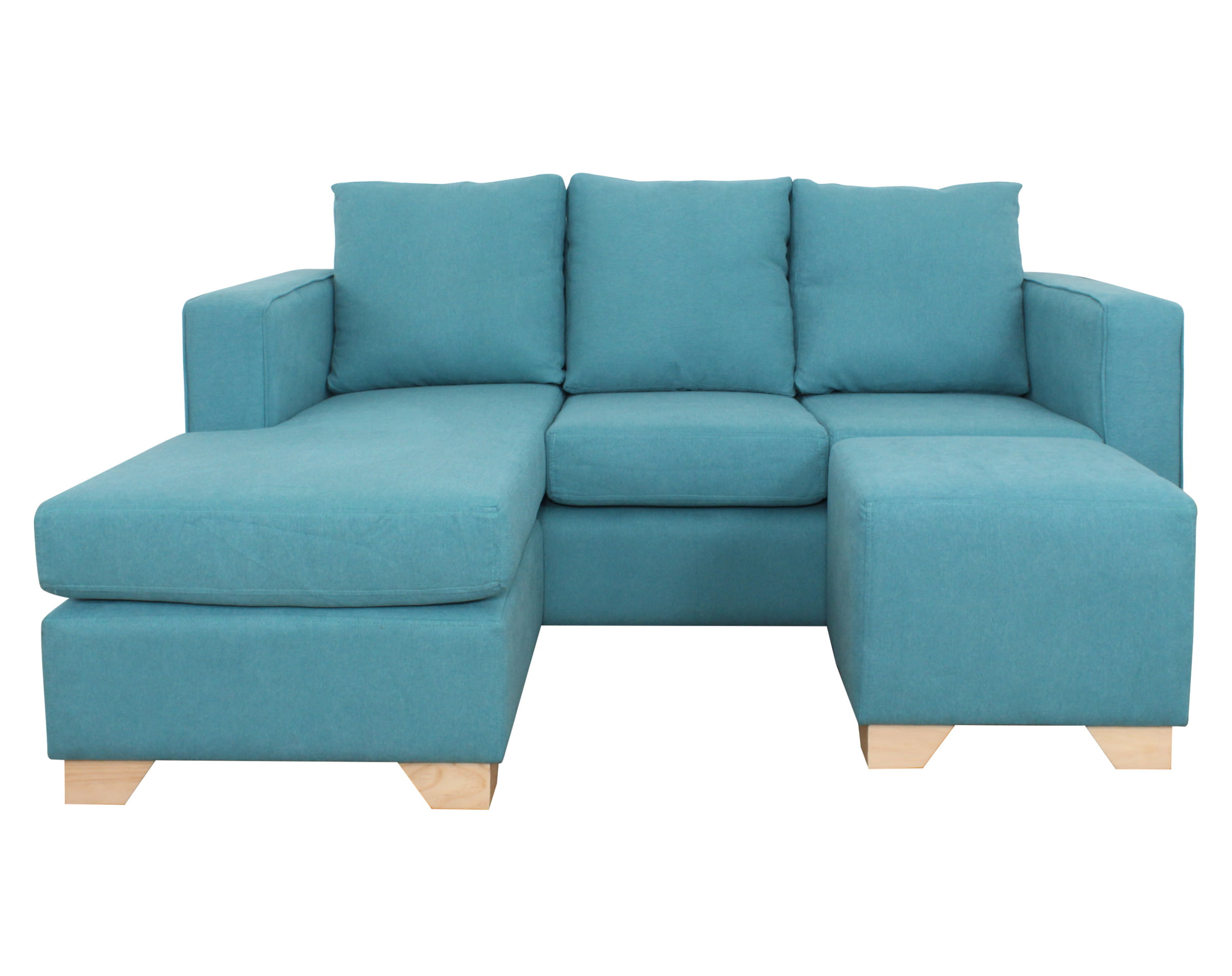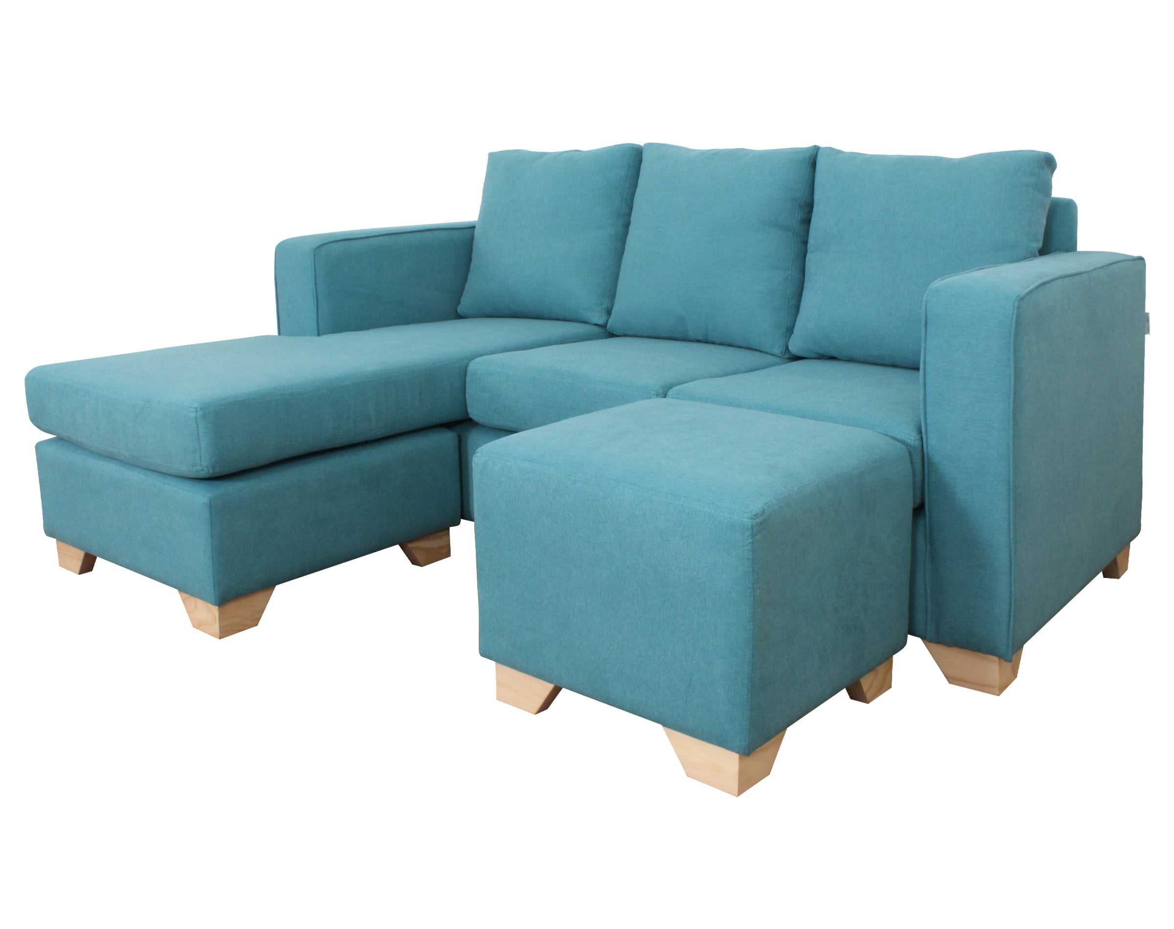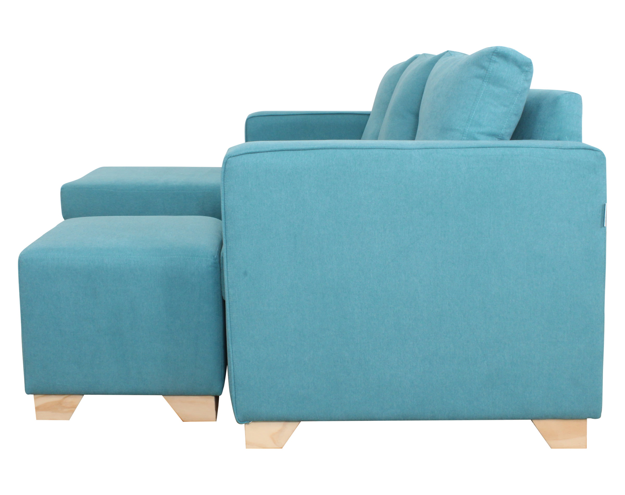 Imagen principal corresponde a Sofá 3 Cuerpos Roma Intercambiable + Pouf Calafate Turquesa pata madera natural ángulo 7 cm.