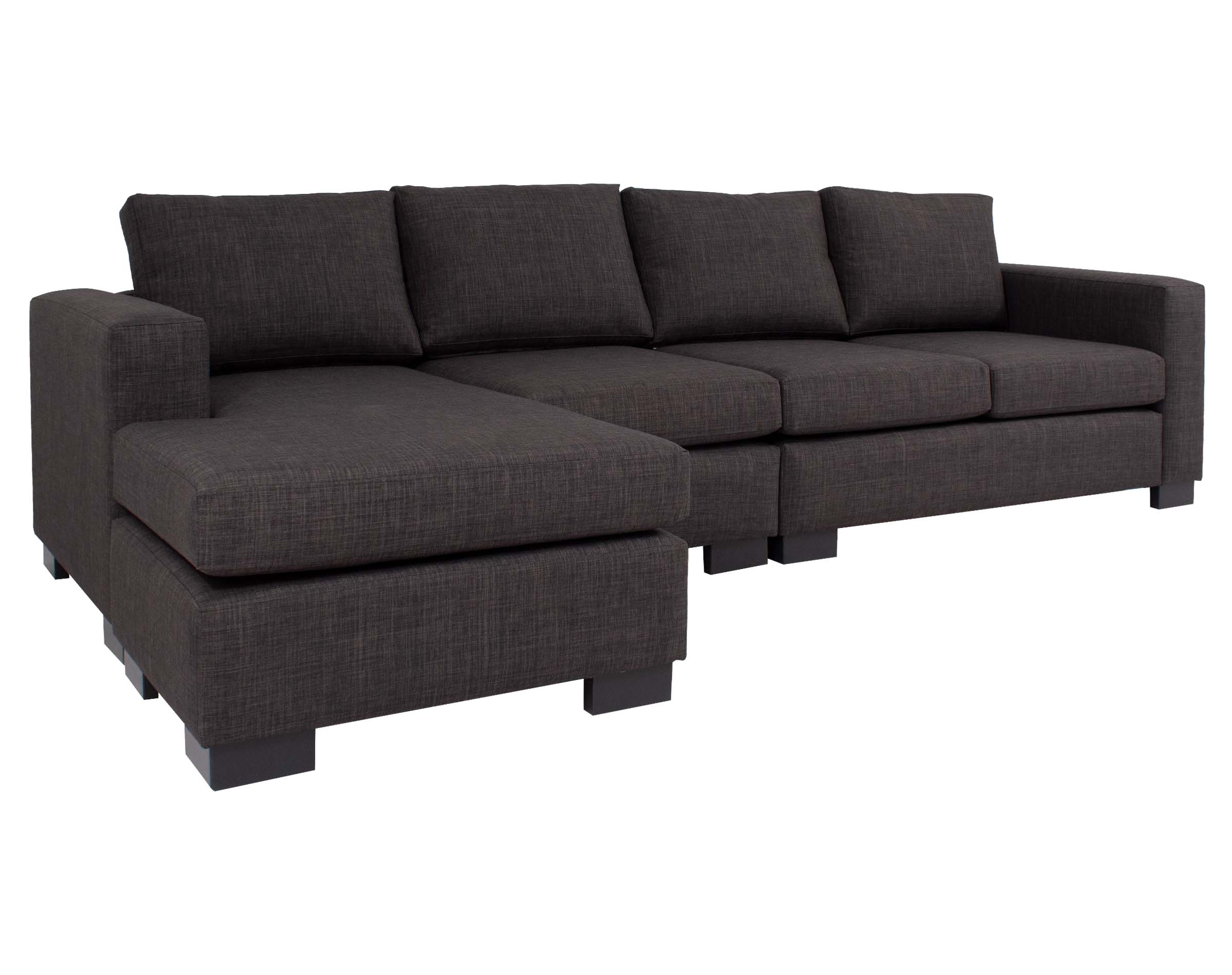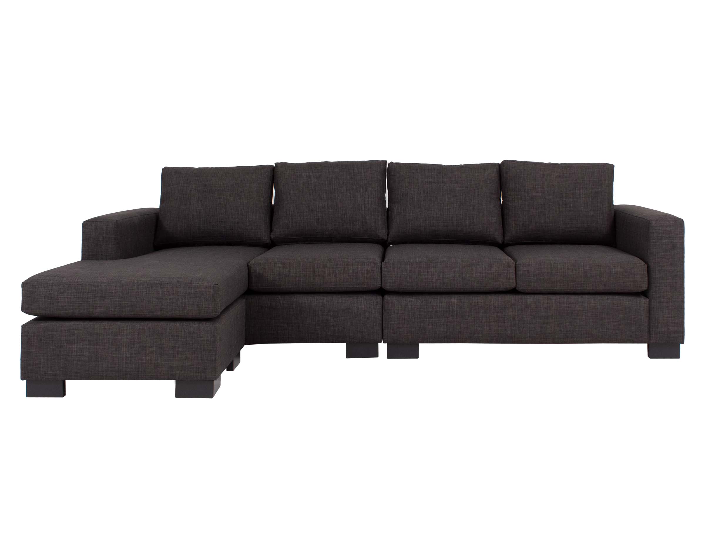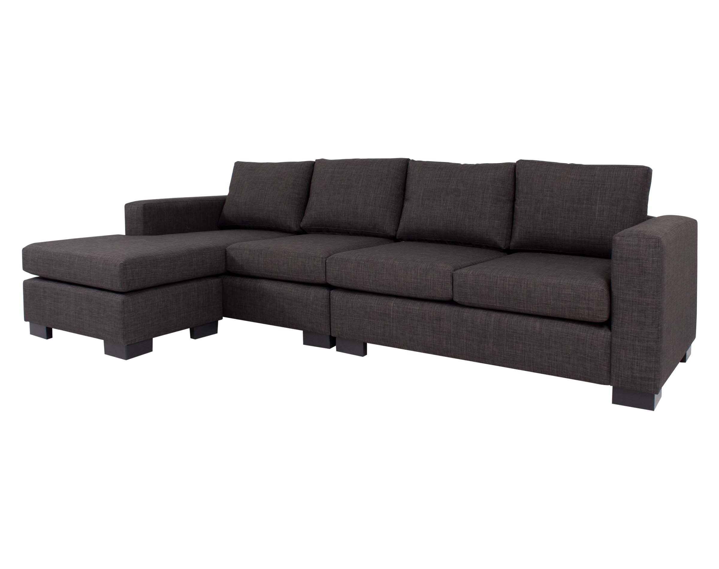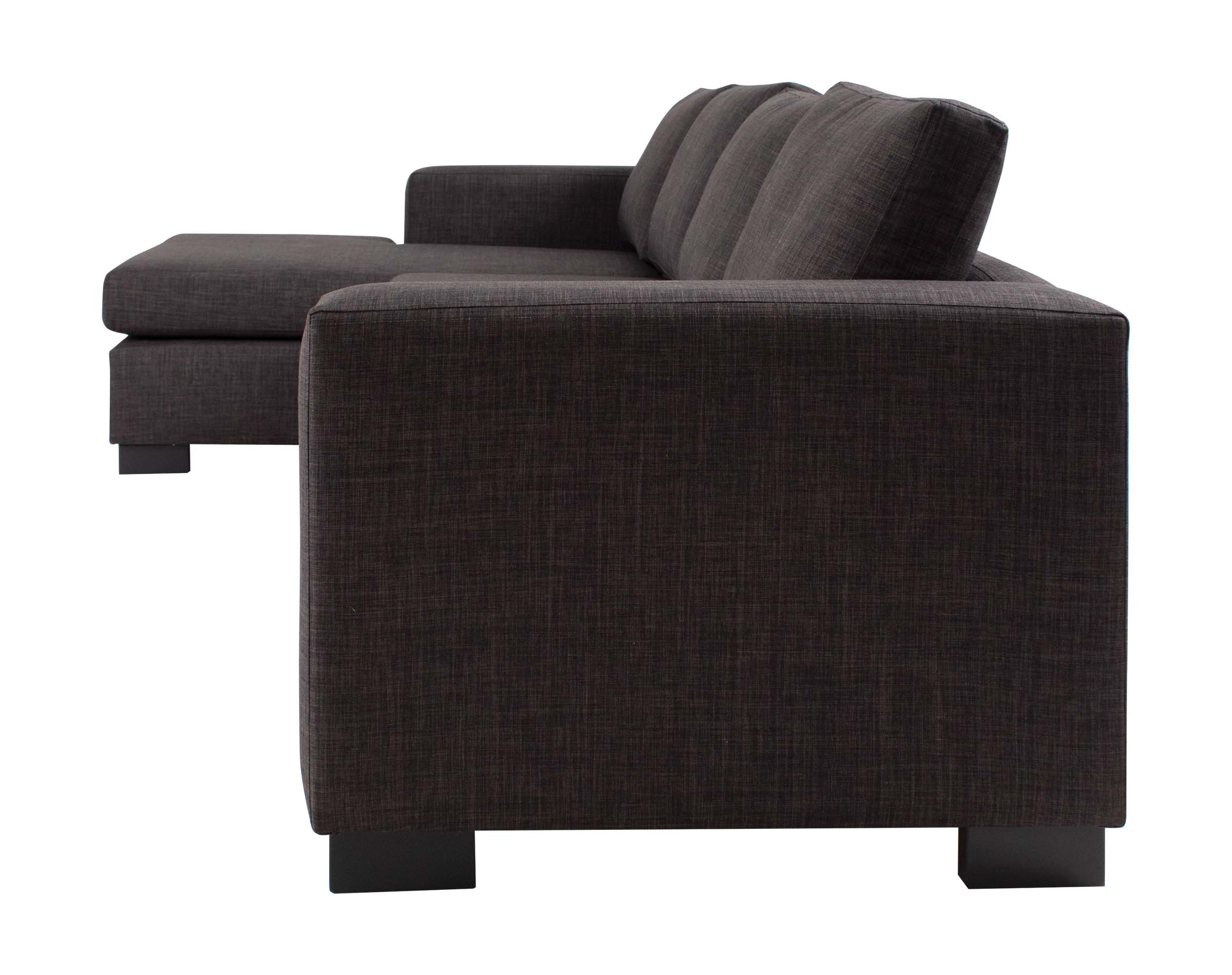 Imagen principal corresponde a Sofá 4 cuerpos Modelo Mónaco con Chaise Longue Intercambiable tapiz Bariloche color marengo con patas de madera color chocolate corte recto.