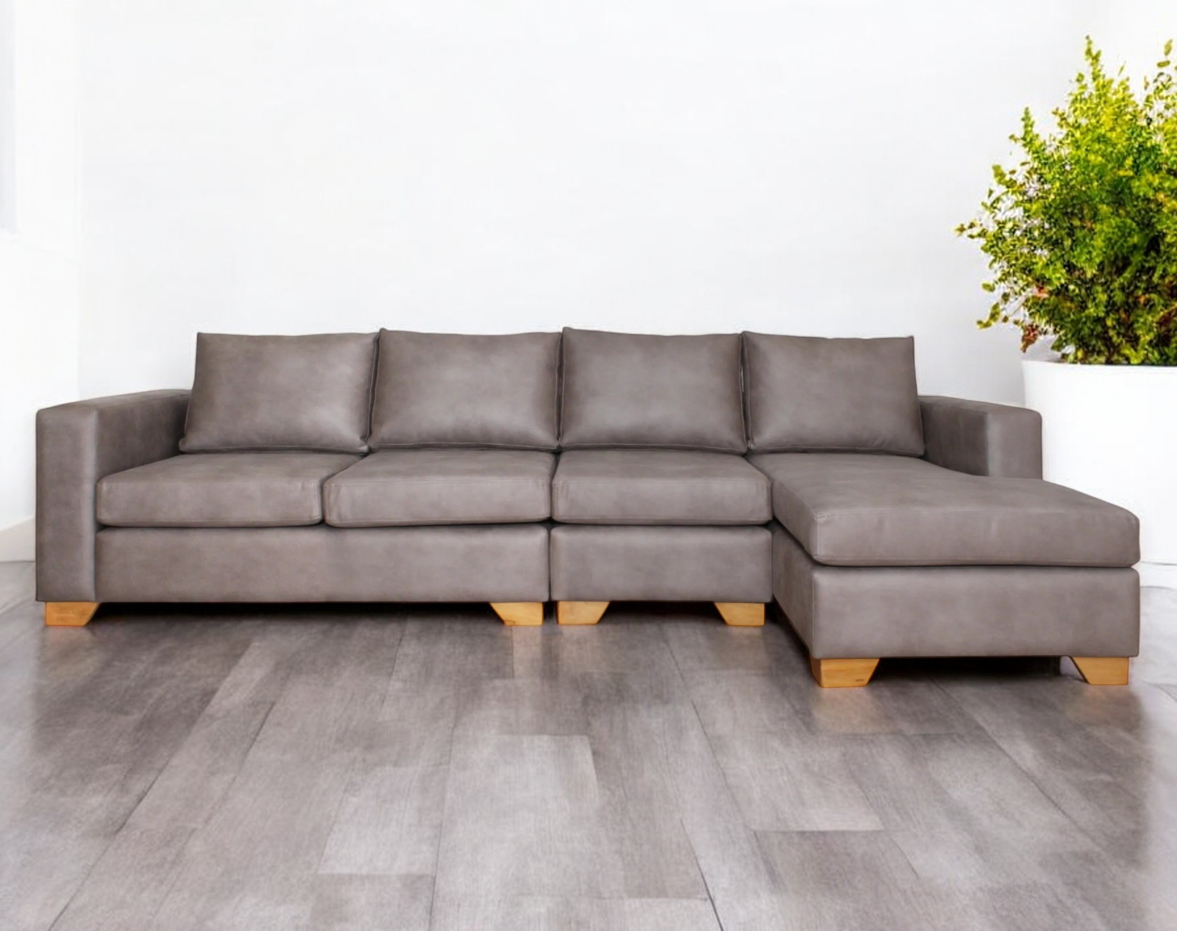 Sofá seccional Mónaco chaise longue derecho + butaca tapiz cuero bonded 30% color gris con patas de madera 7 cm color miel corte ángulo.