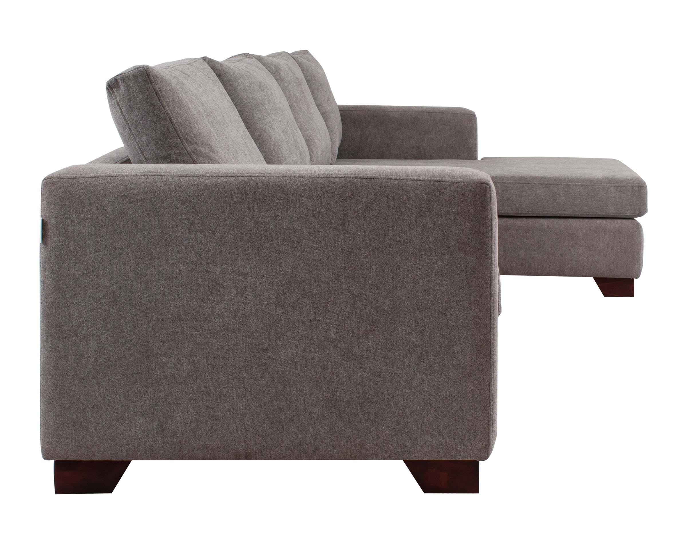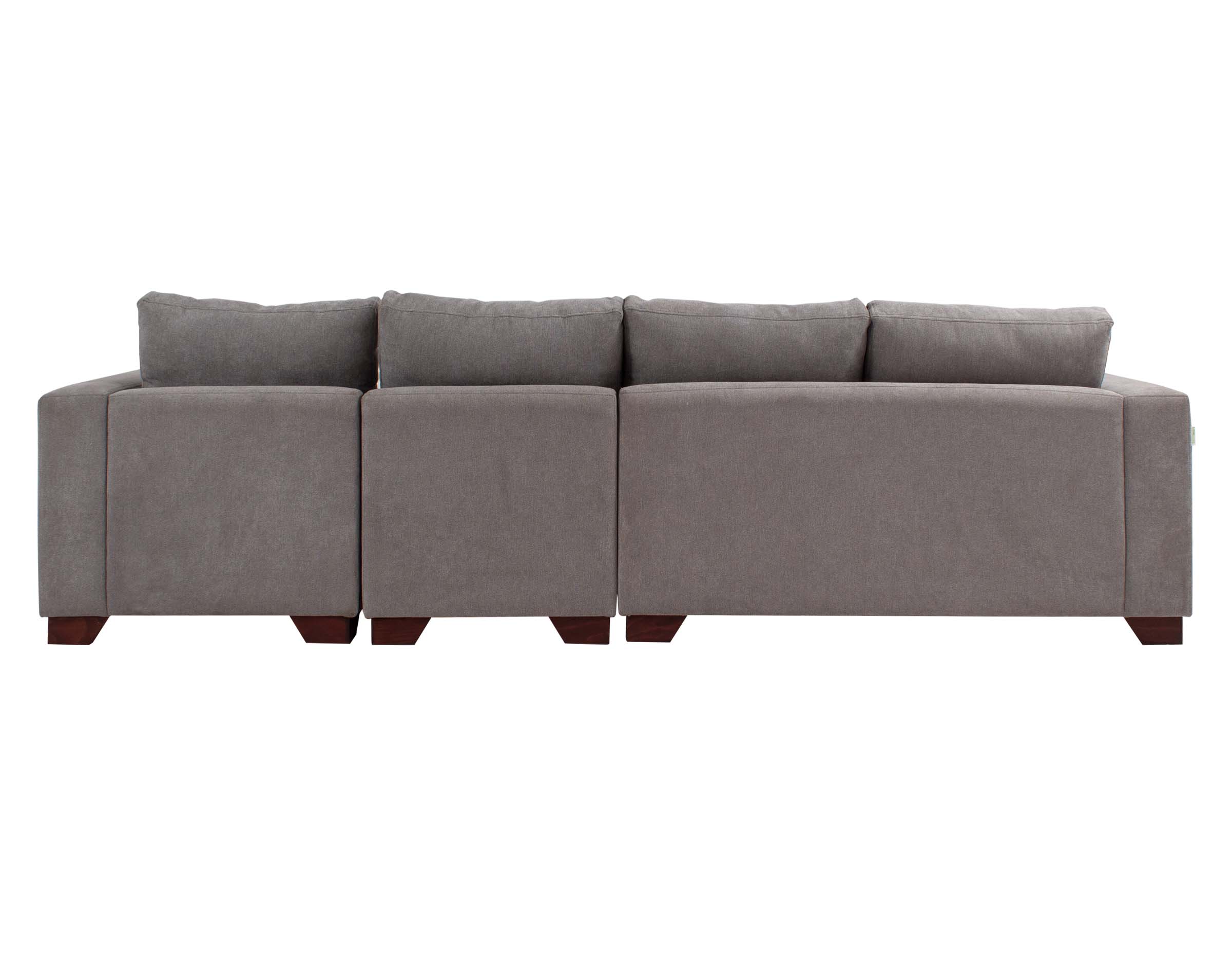 La imagen principal muestra el Sofá Seccional Mónaco Derecho + Butaca Finesse Gris Claro patas de madera caoba ángulo 7 cm.