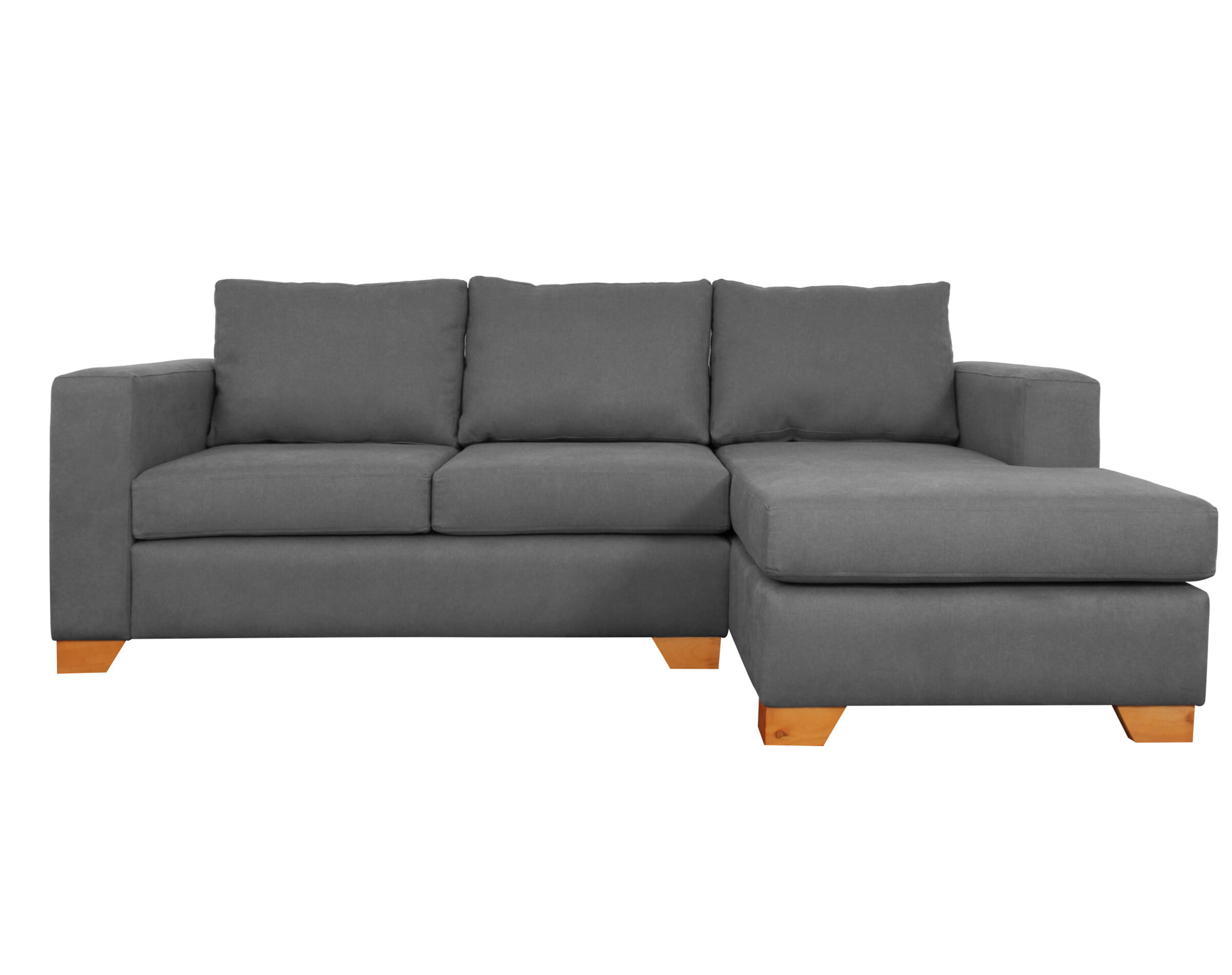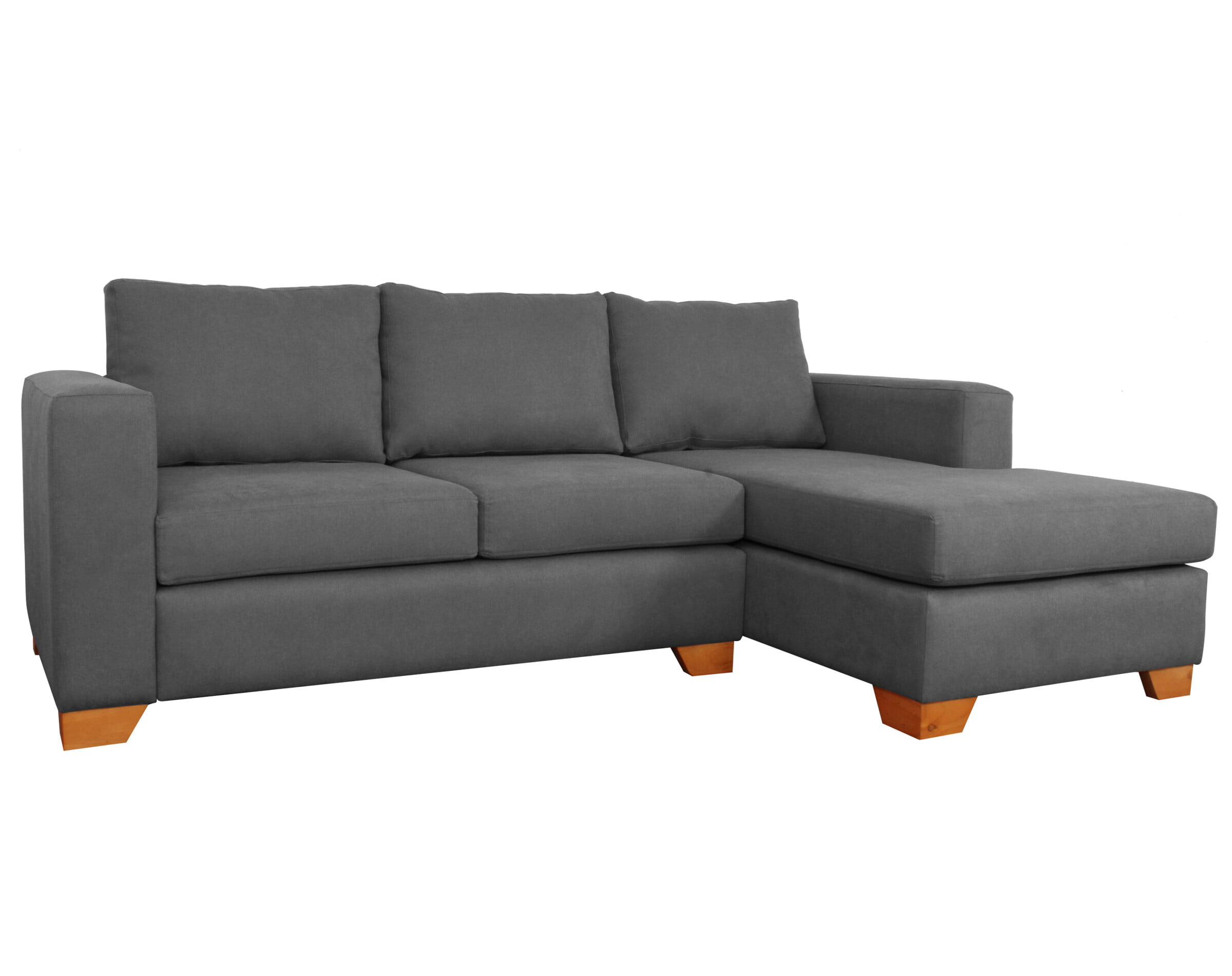 Imagen principal corresponde a Sofá Seccional Mónaco Derecho Calafate color gris oscuro pata madera miel ángulo 7 cm.