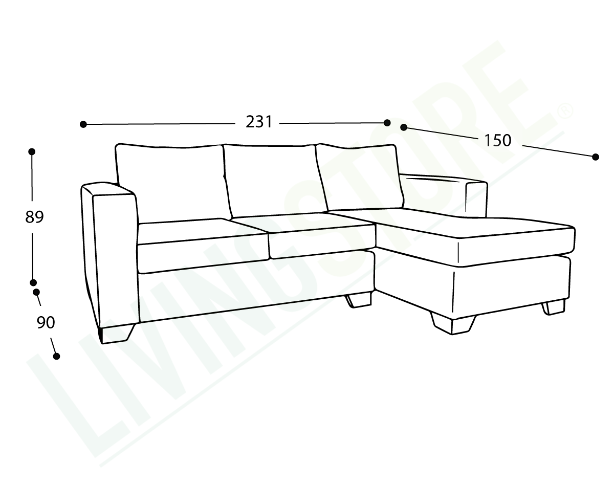 - Dimensiones totales: 231 cm largo x 90 cm profundidad x 150 cm chaise longue.