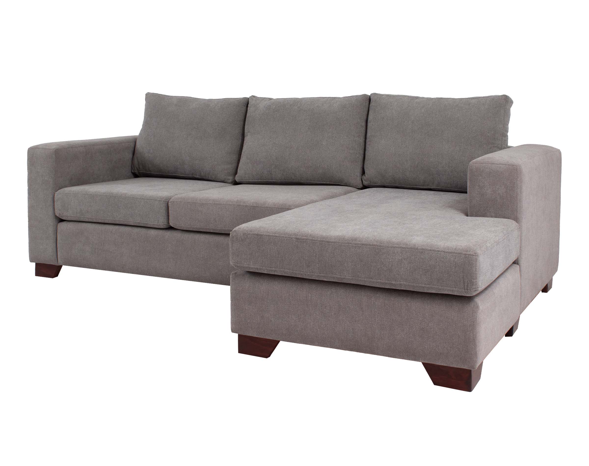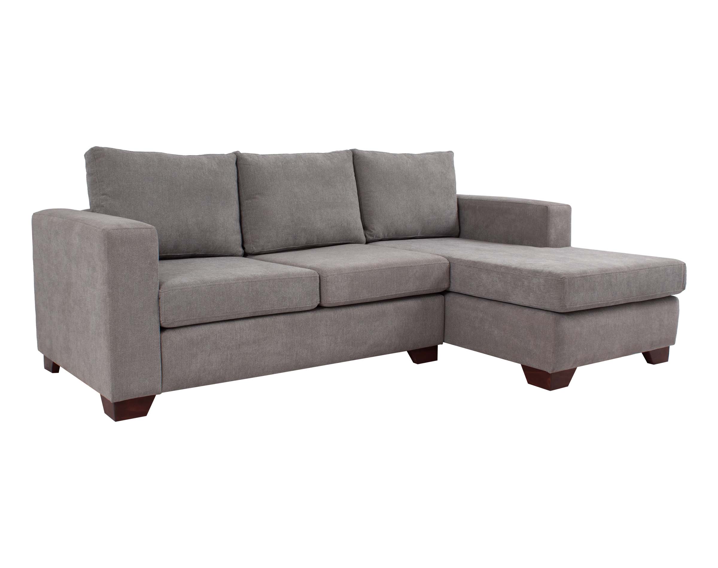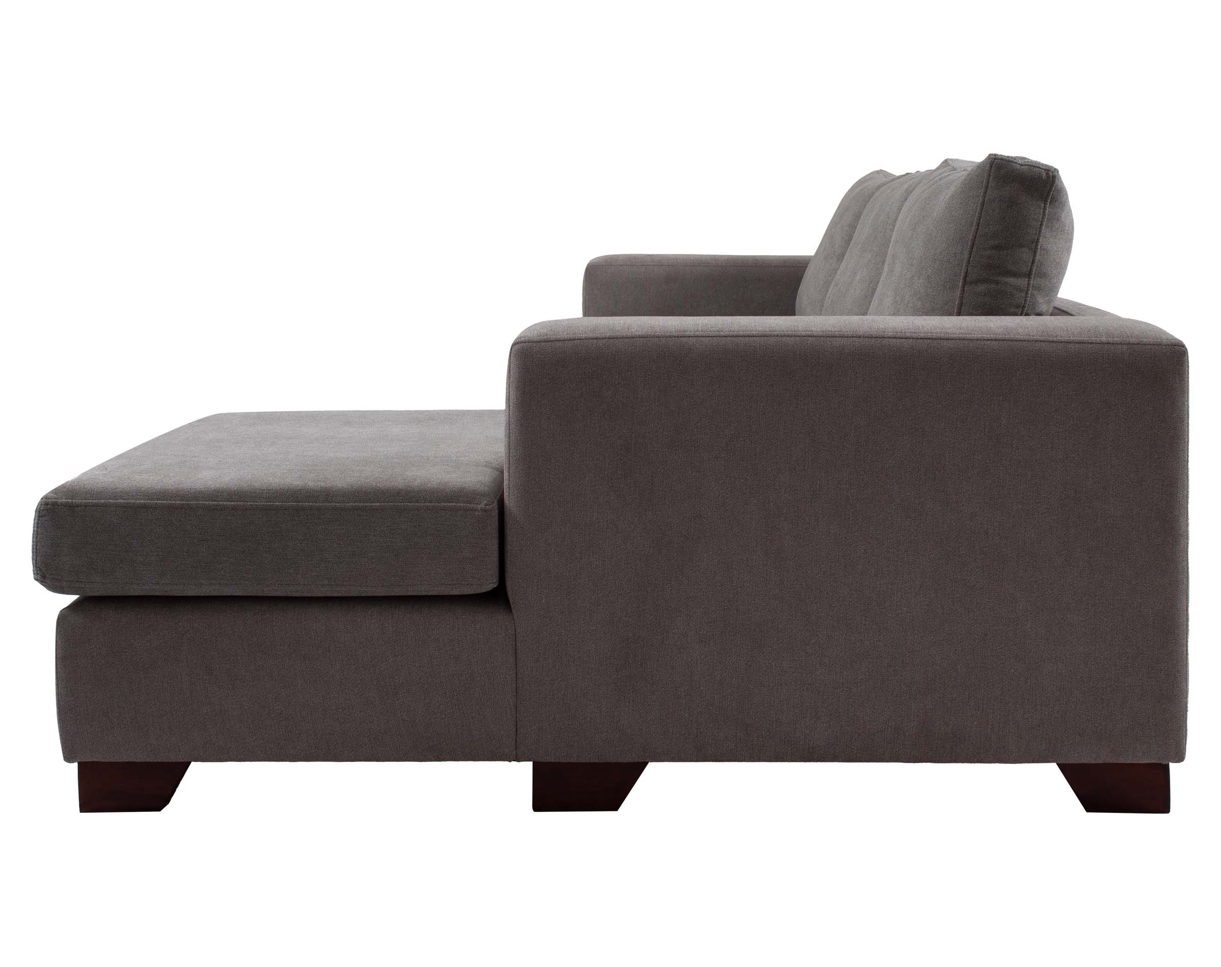 Imagen principal corresponde a Seccional Mónaco chaise longue derecho tapiz Finesse color gris medio con patas de madera color ciprés corte ángulo.
