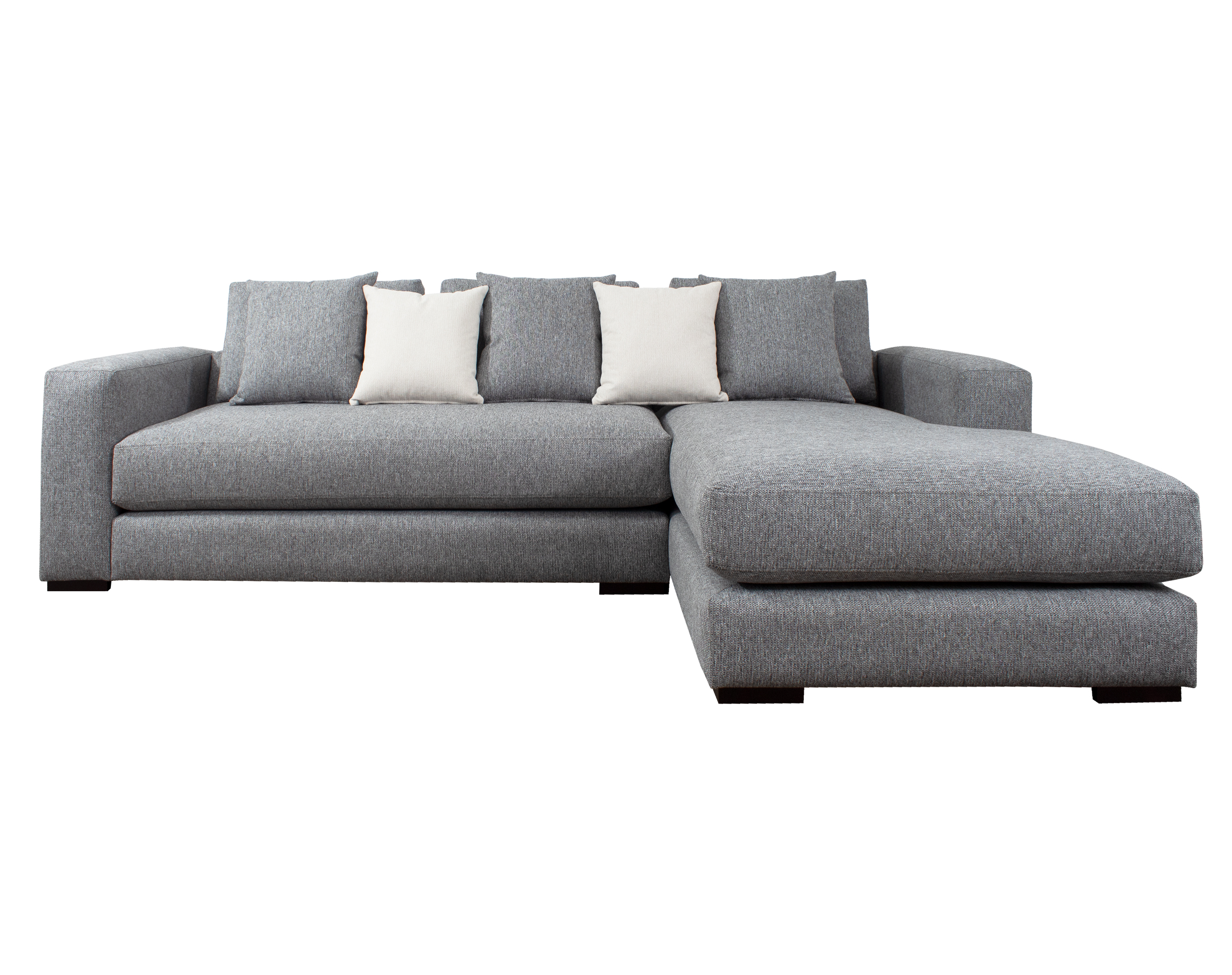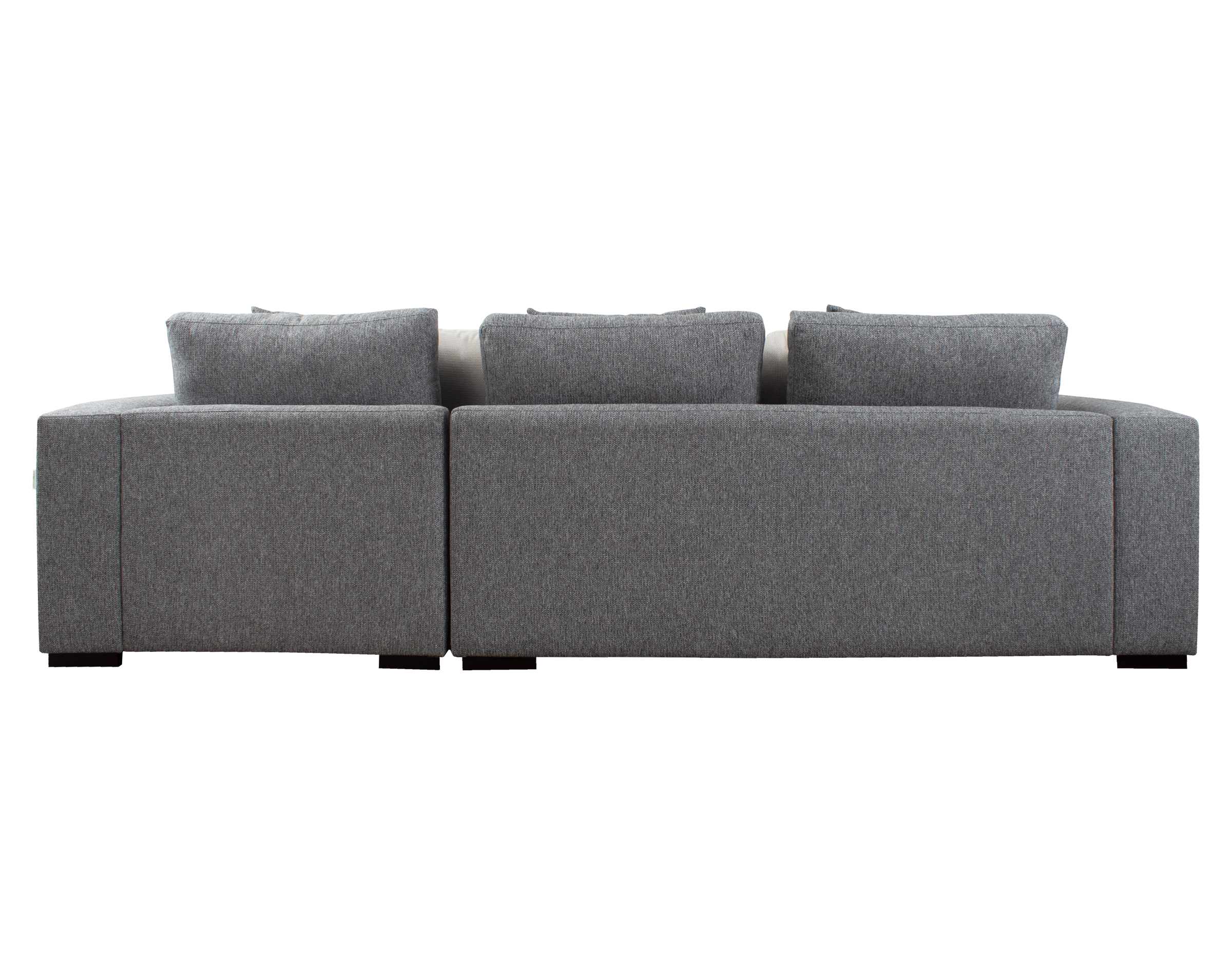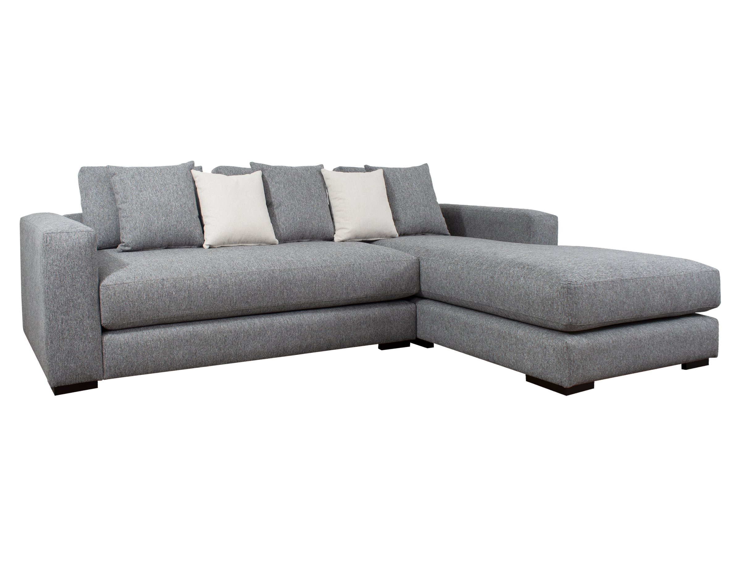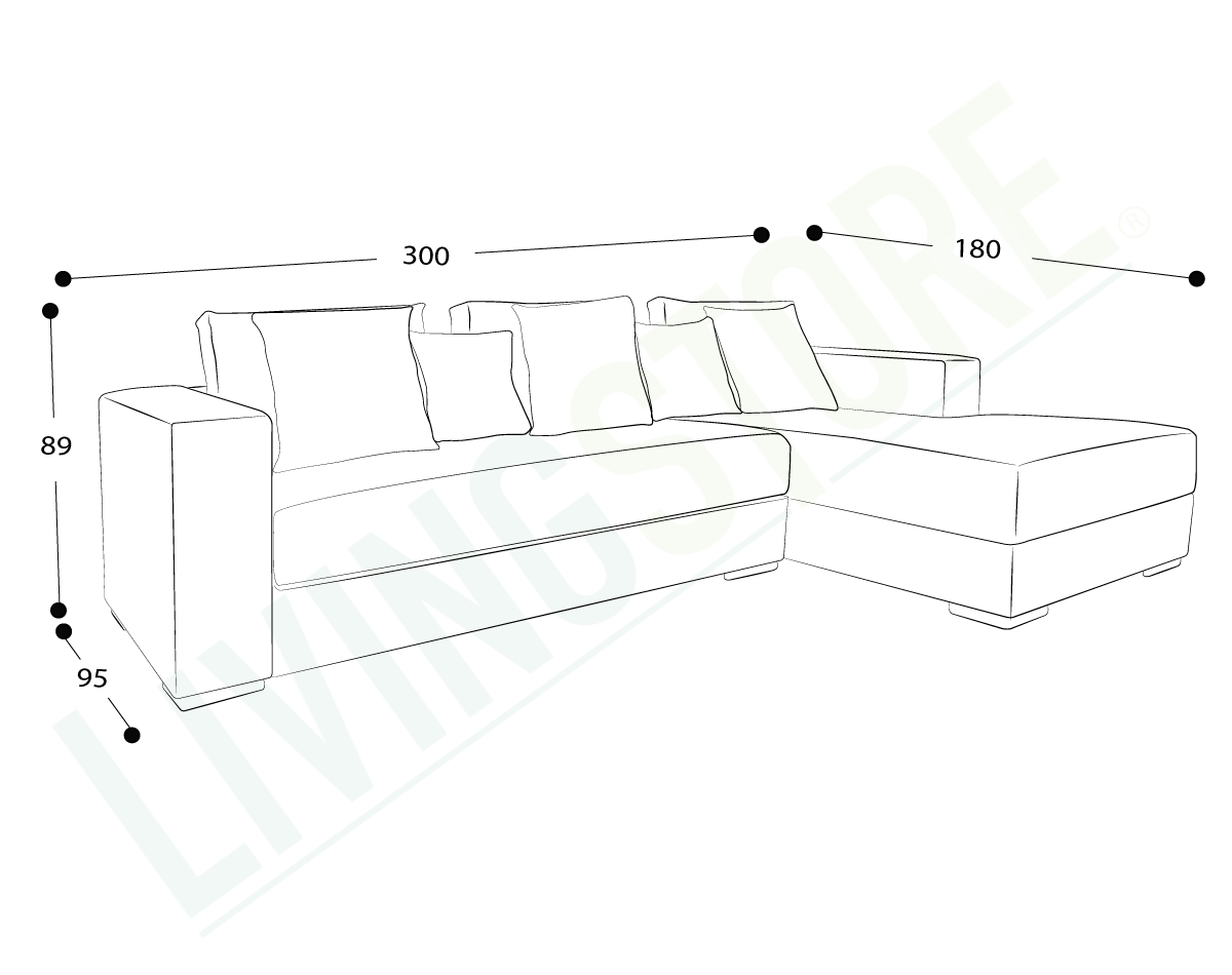Las patas bajas, disponibles en opciones de madera o metal, y los brazos anchos de 25 cm con doble acolchado, añaden robustez y confort al diseño. El sofá seccional también incluye cojines removibles con fundas interiores de microfibra y un set de cojines pequeños para ajustar la profundidad según las preferencias del usuario.