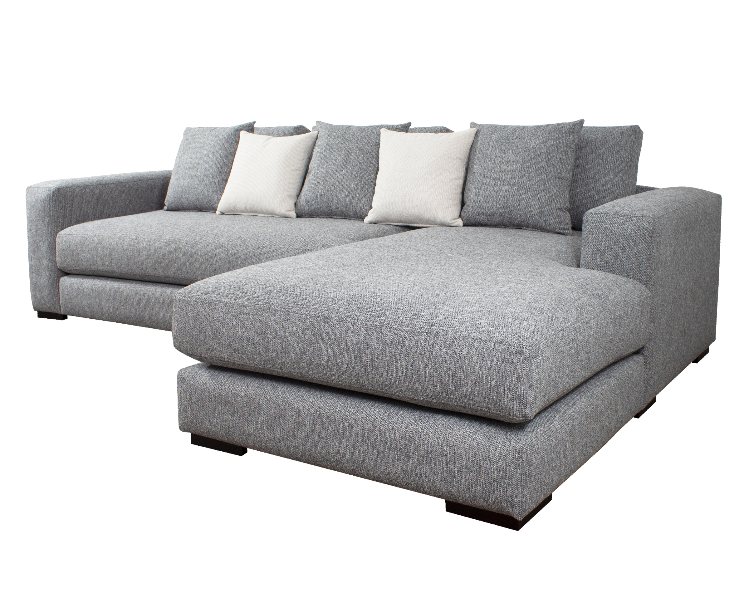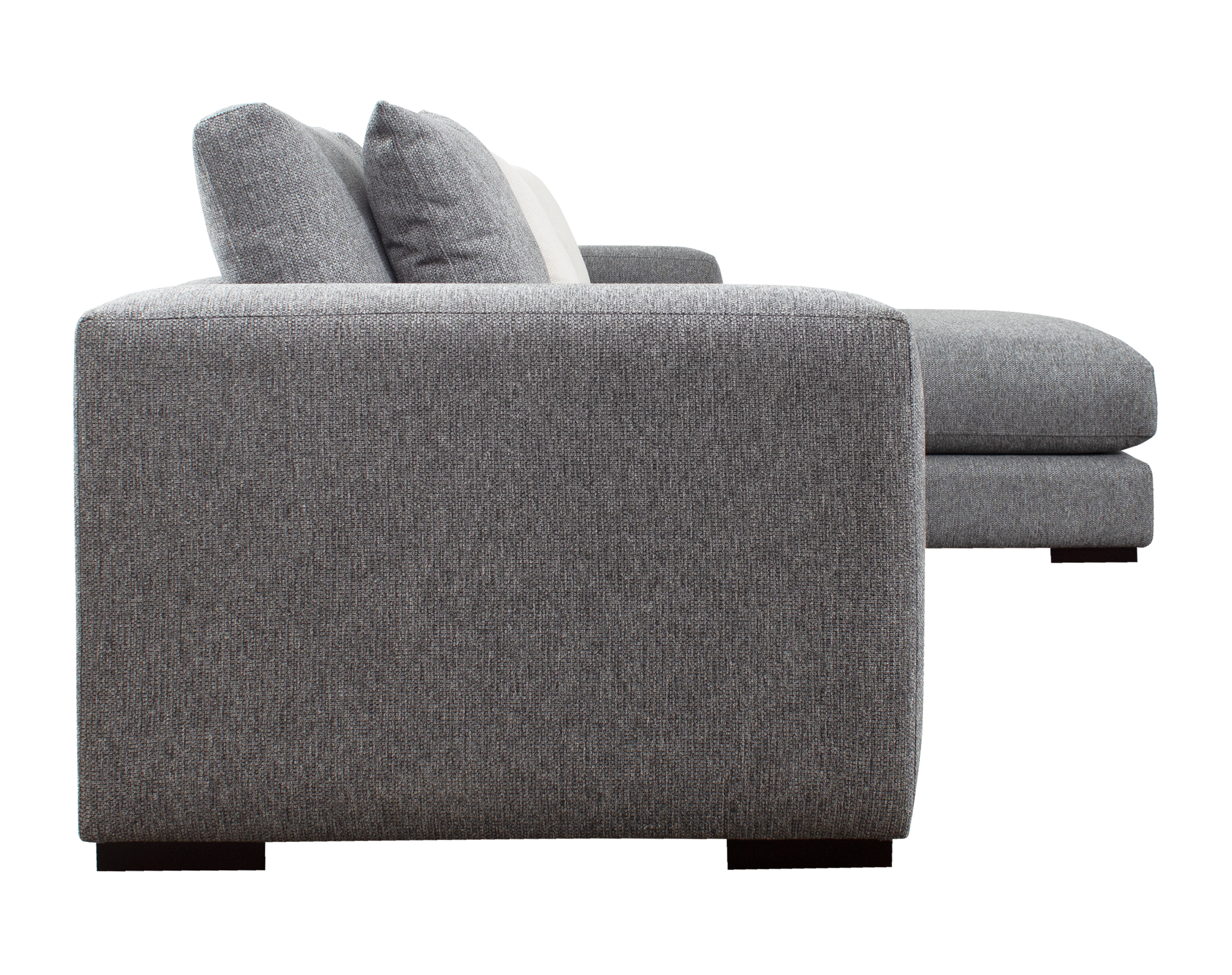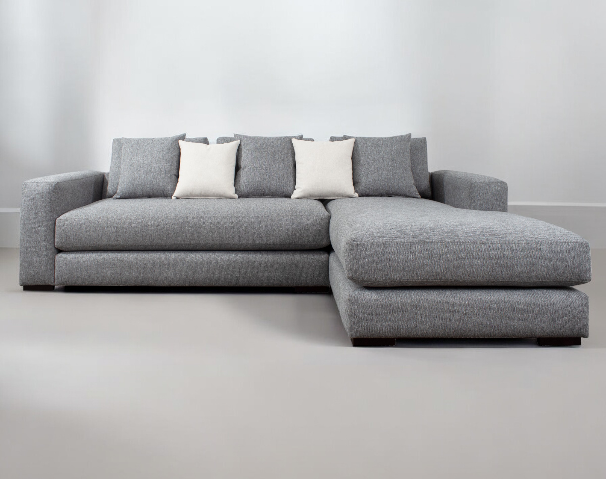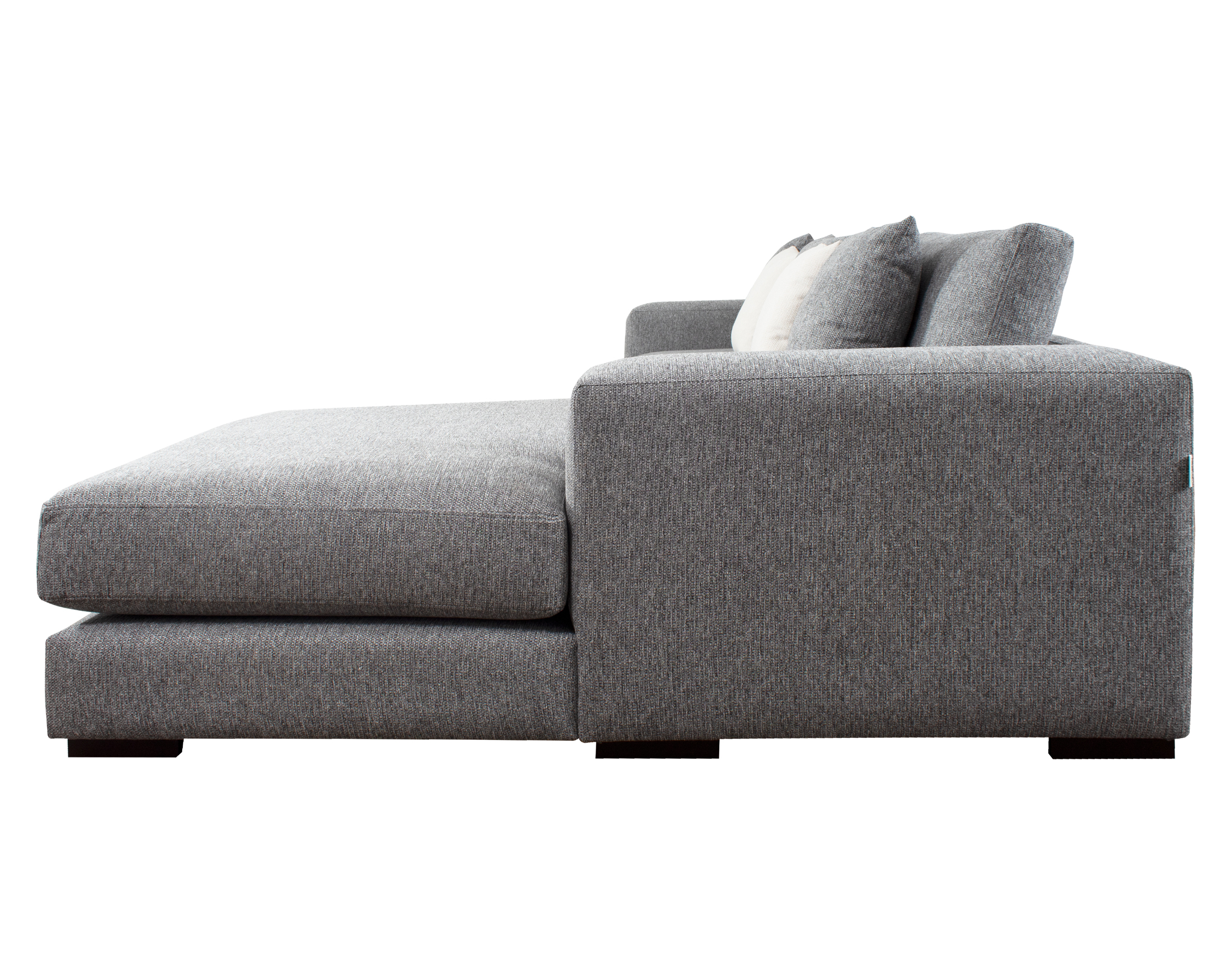 Las patas bajas, disponibles en opciones de madera o metal, y los brazos anchos de 25 cm con doble acolchado, añaden robustez y confort al diseño. El sofá seccional también incluye cojines removibles con fundas interiores de microfibra y un set de cojines pequeños para ajustar la profundidad según las preferencias del usuario.