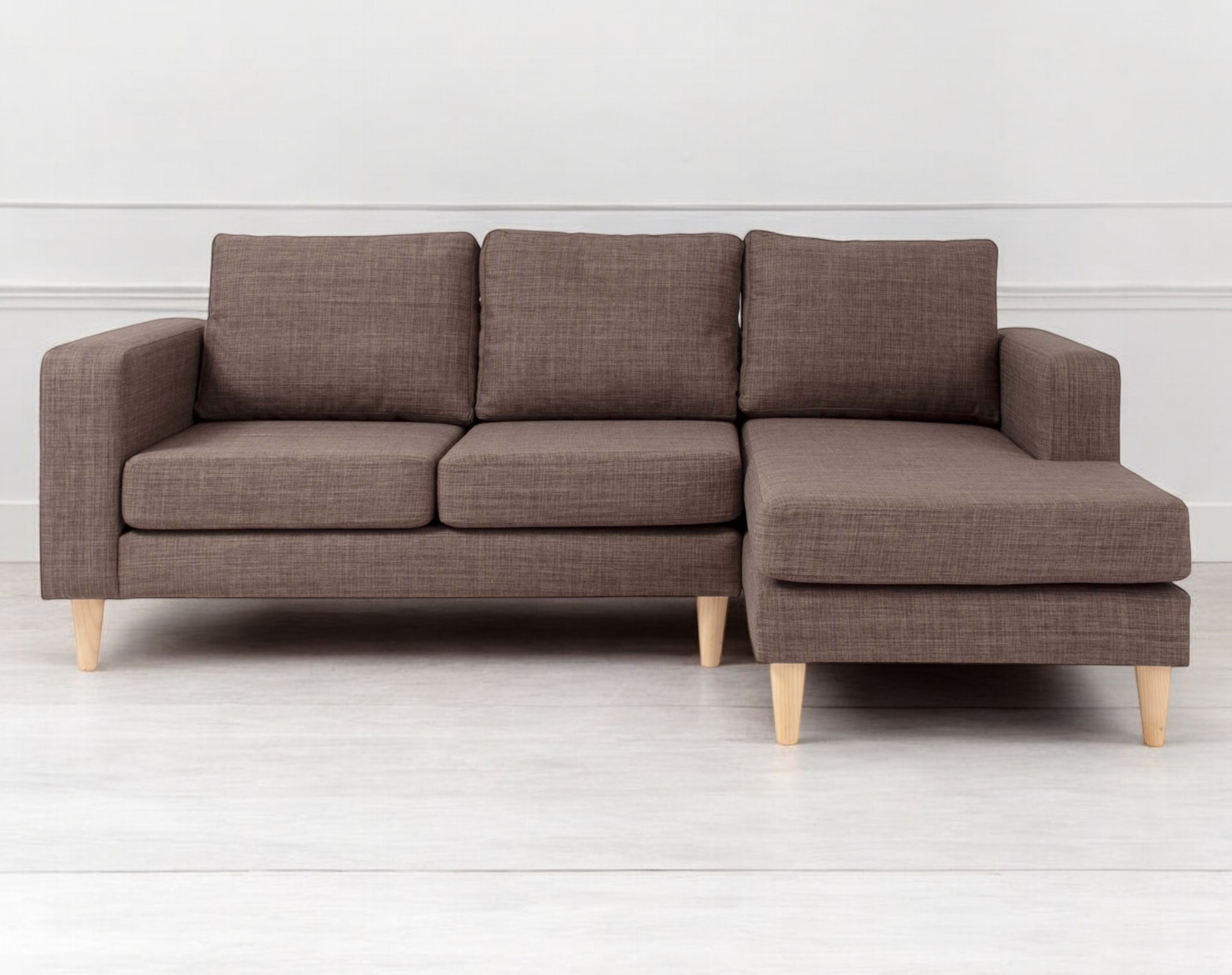 Sofá seccional modelo Tai con chaise longue derecho, tapizado en Bariloche alto tráfico color castaño. Patas de madera cónica de 15 cm en tono miel complementan su diseño.