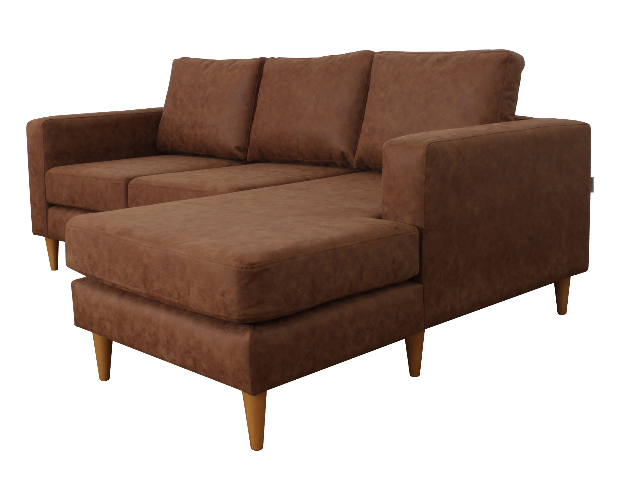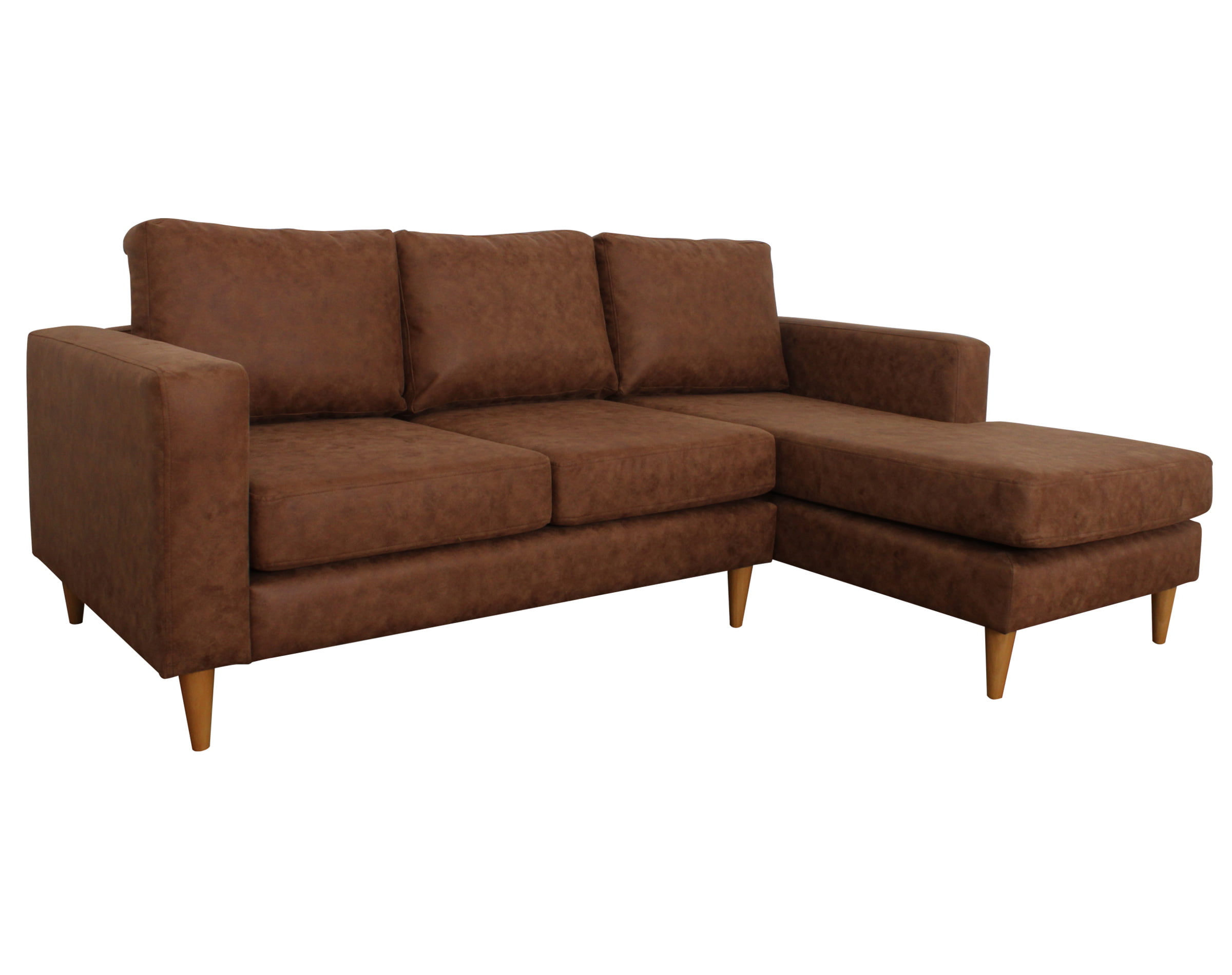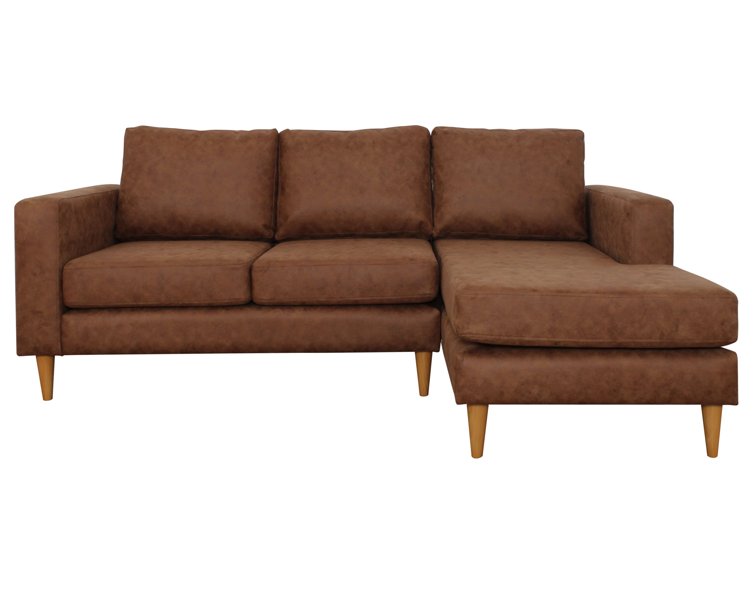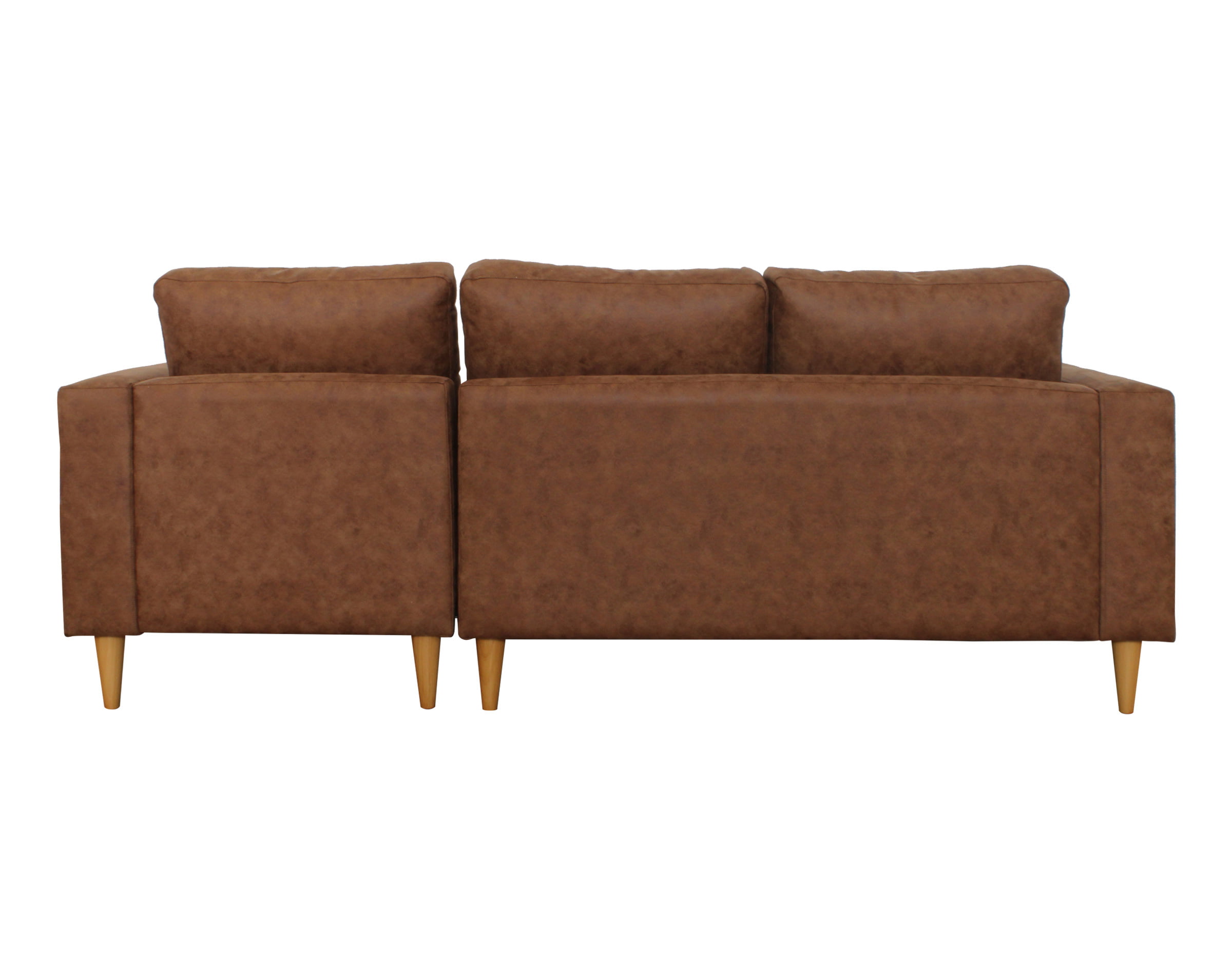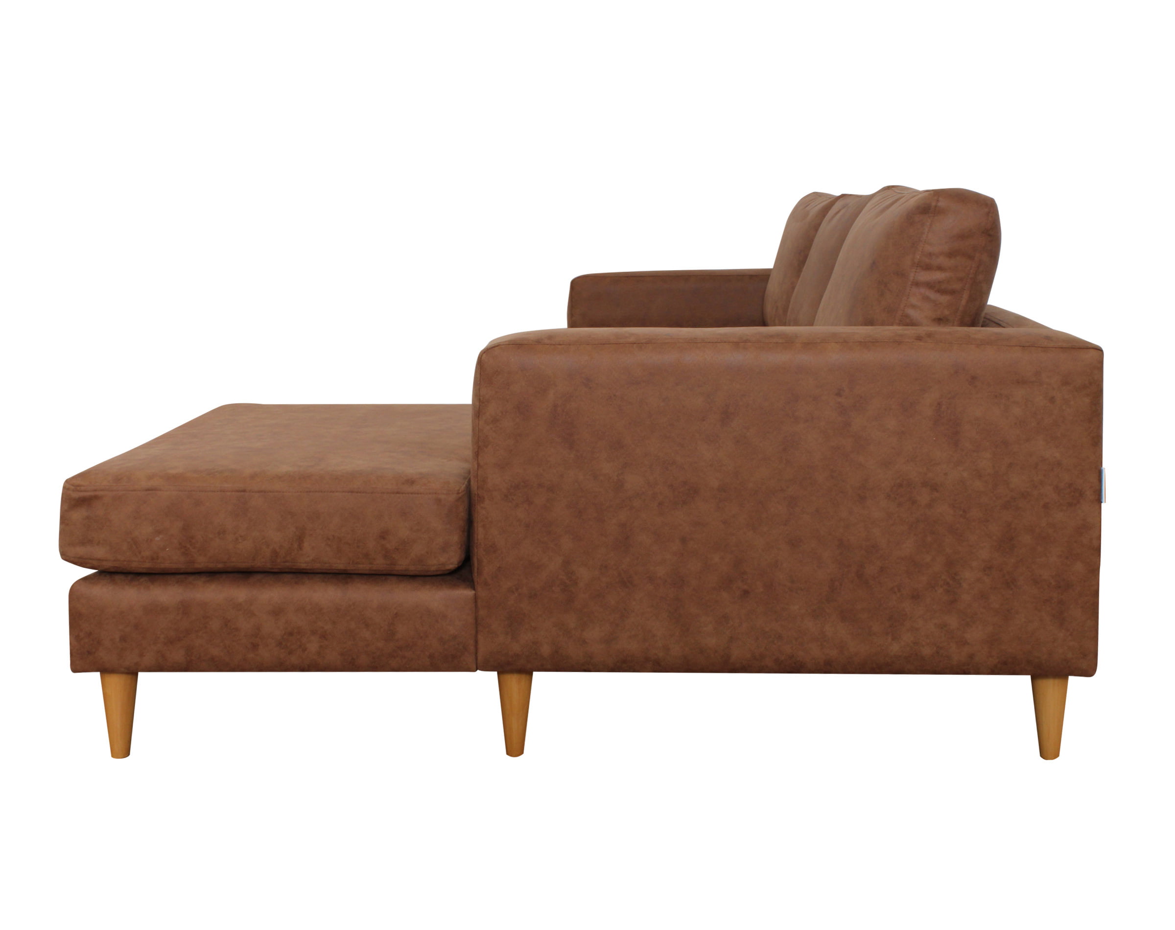 Imagen corresponde a Sofá Seccional Tai Chaise Longue Derecho tapizado en Cuero bonded 30% cognac y patas de madera cónicas color miel altura 15 cm.
