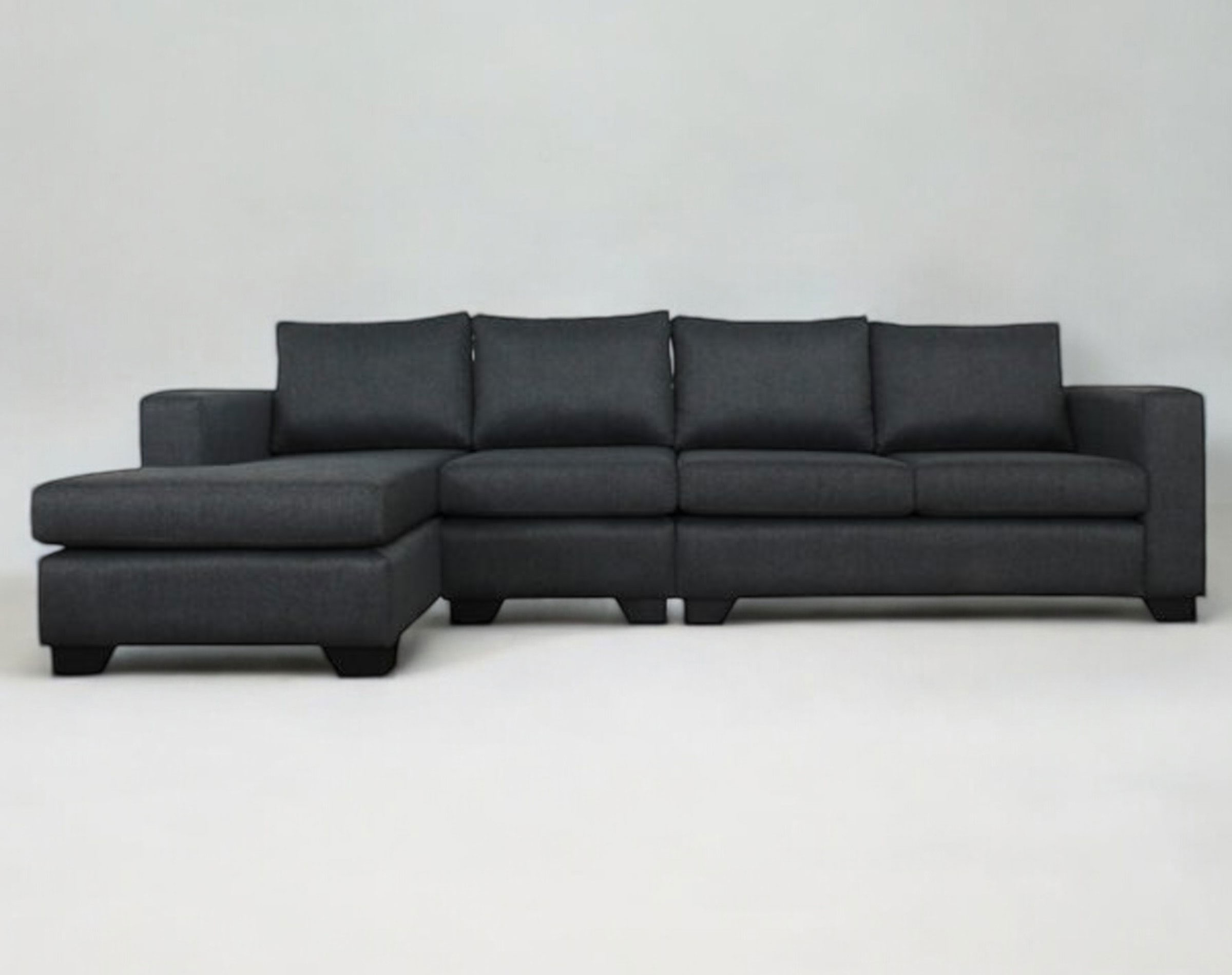 El Sofá Seccional Chaise Longue Mónaco Living Store incluye 3 piezas: Sofá Chaise, butaca y sofá, todo unido por un anclaje metálico.