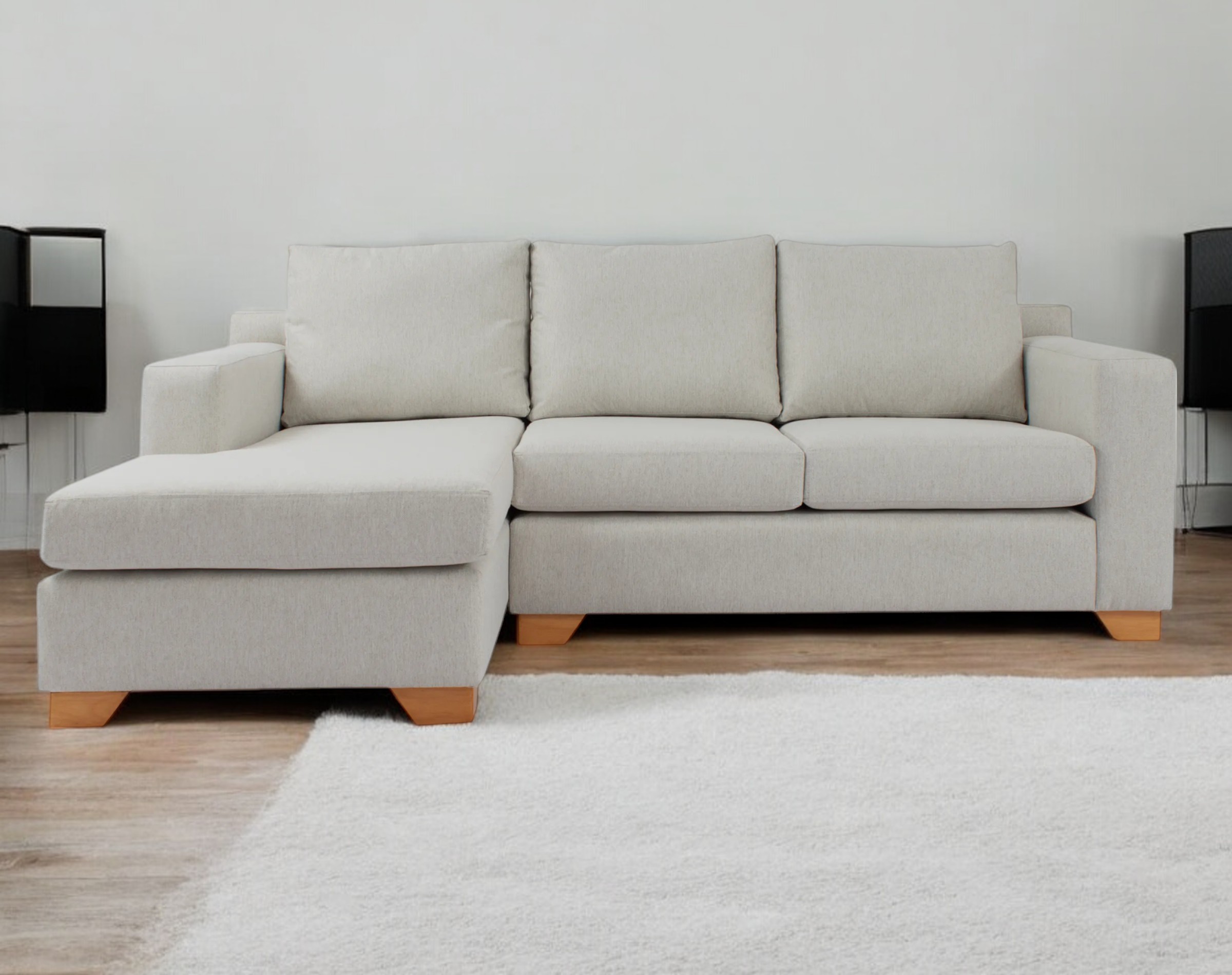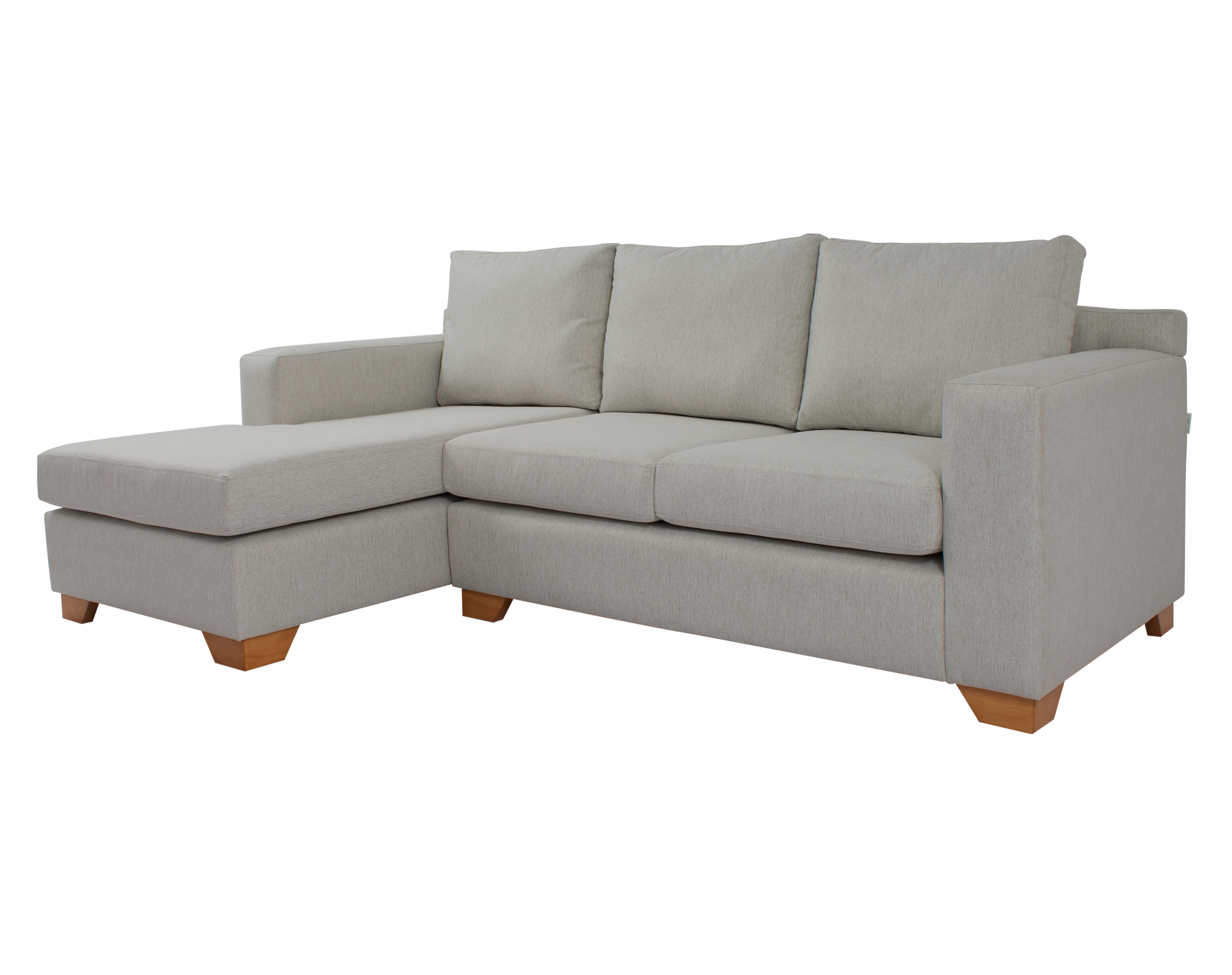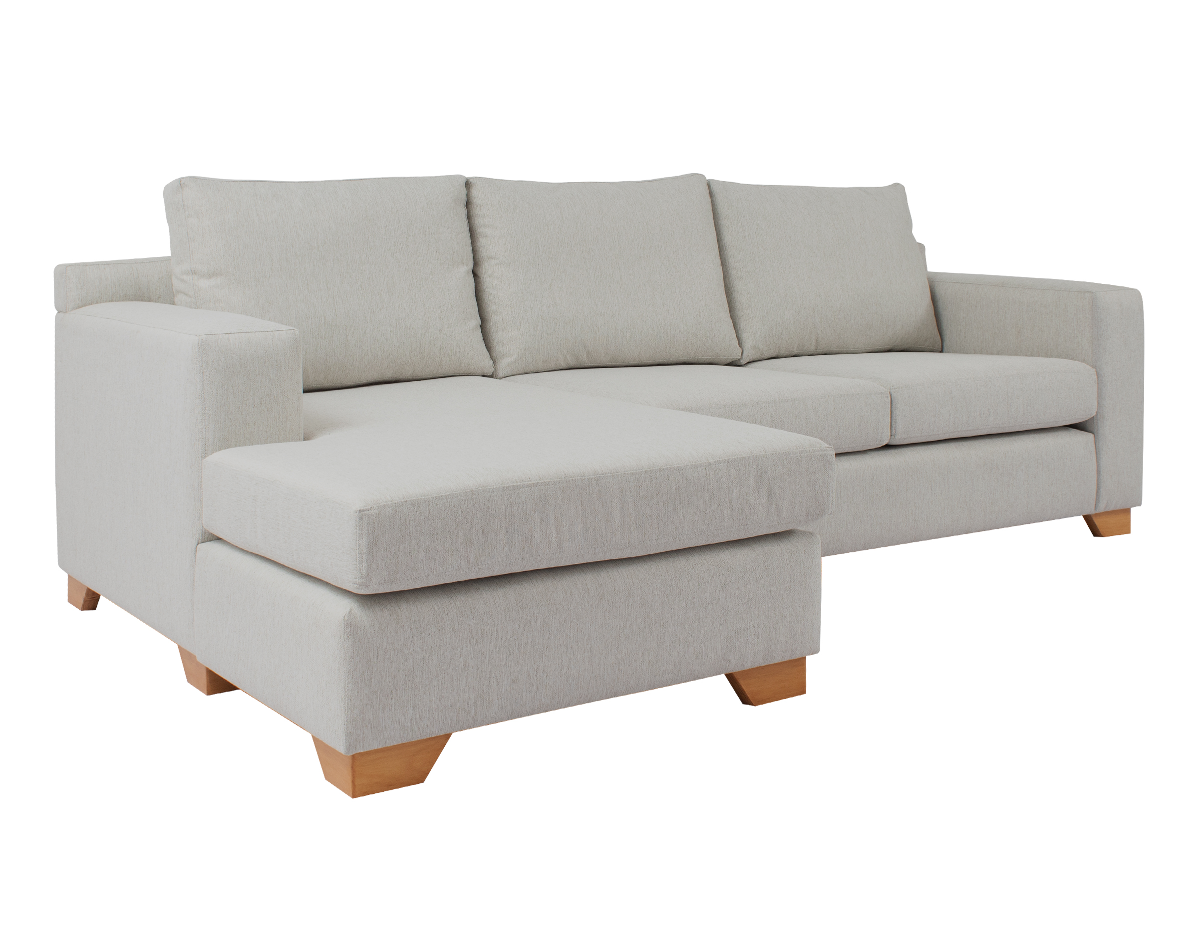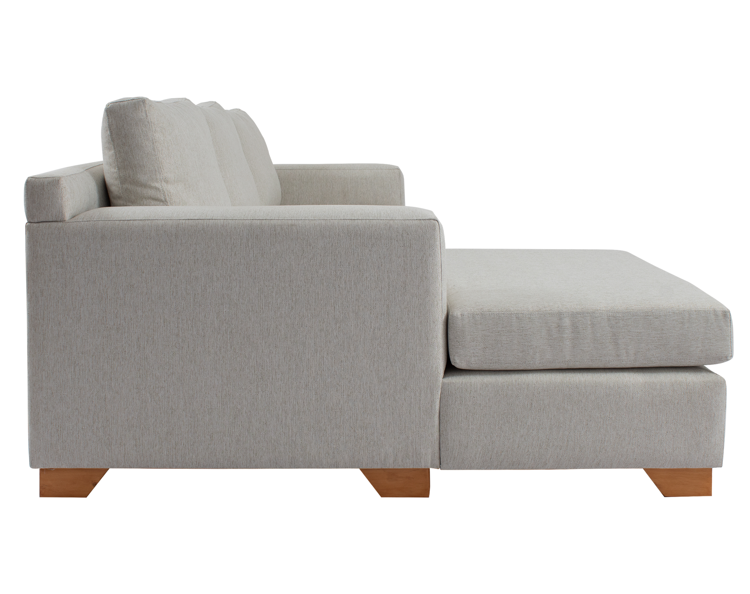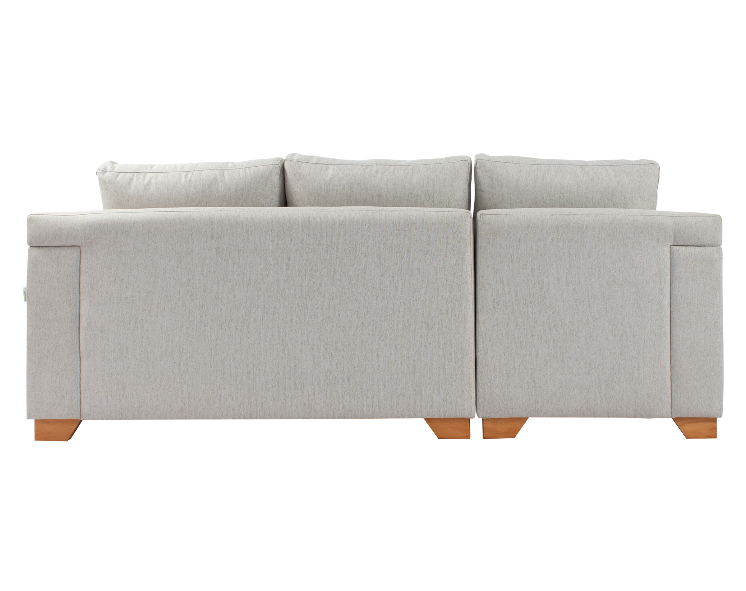 Sofá seccional Isabella chaise longue izquierdo tapiz WR Protect color 73 con pata madera 7 cm color miel corte ángulo, diseñado con terminaciones marcadas, asientos y respaldos con cierre removible.