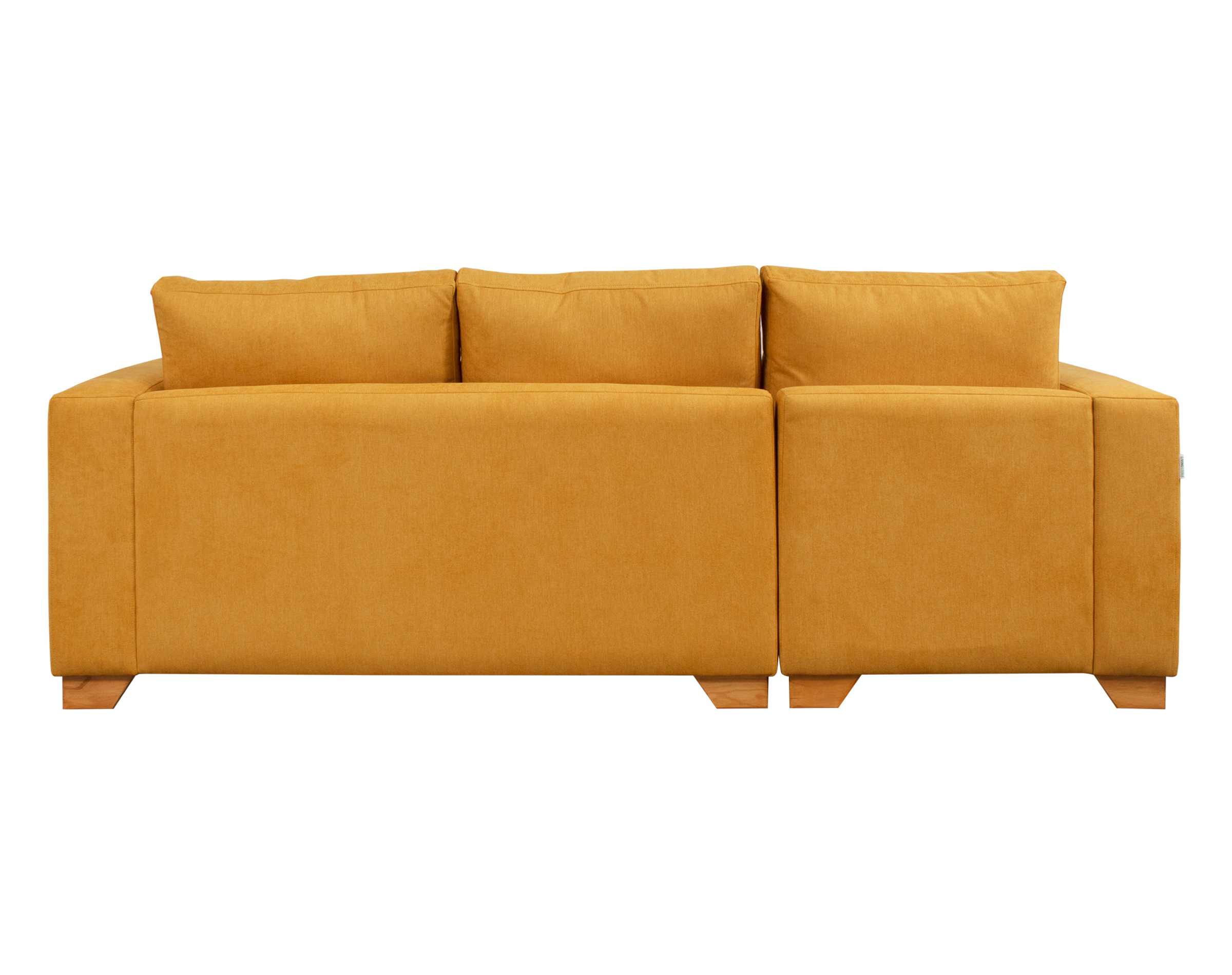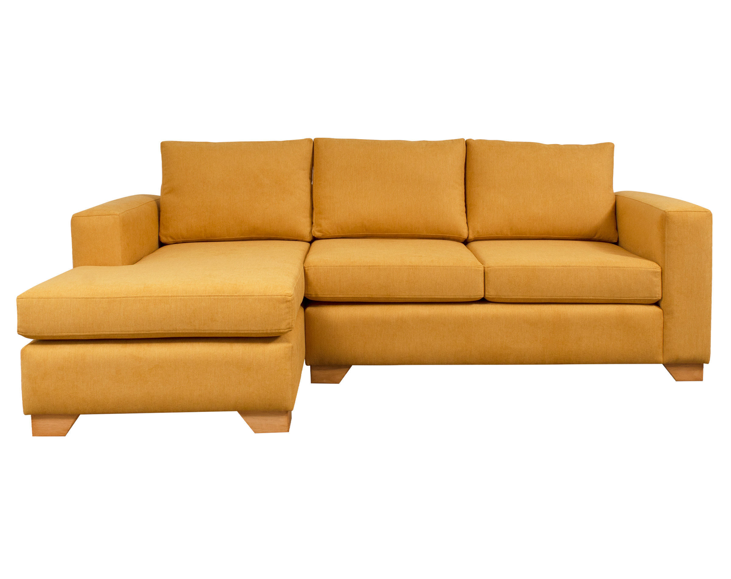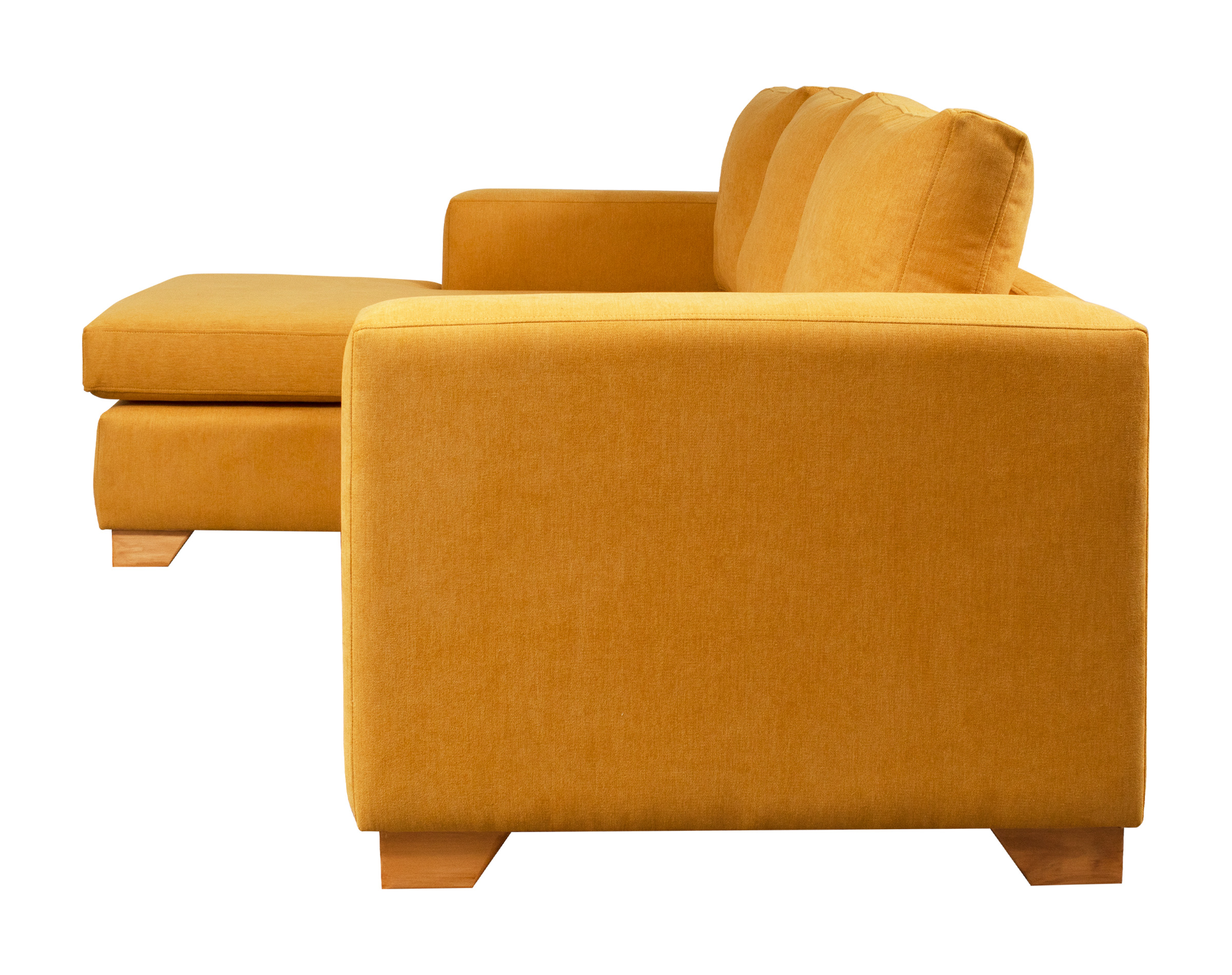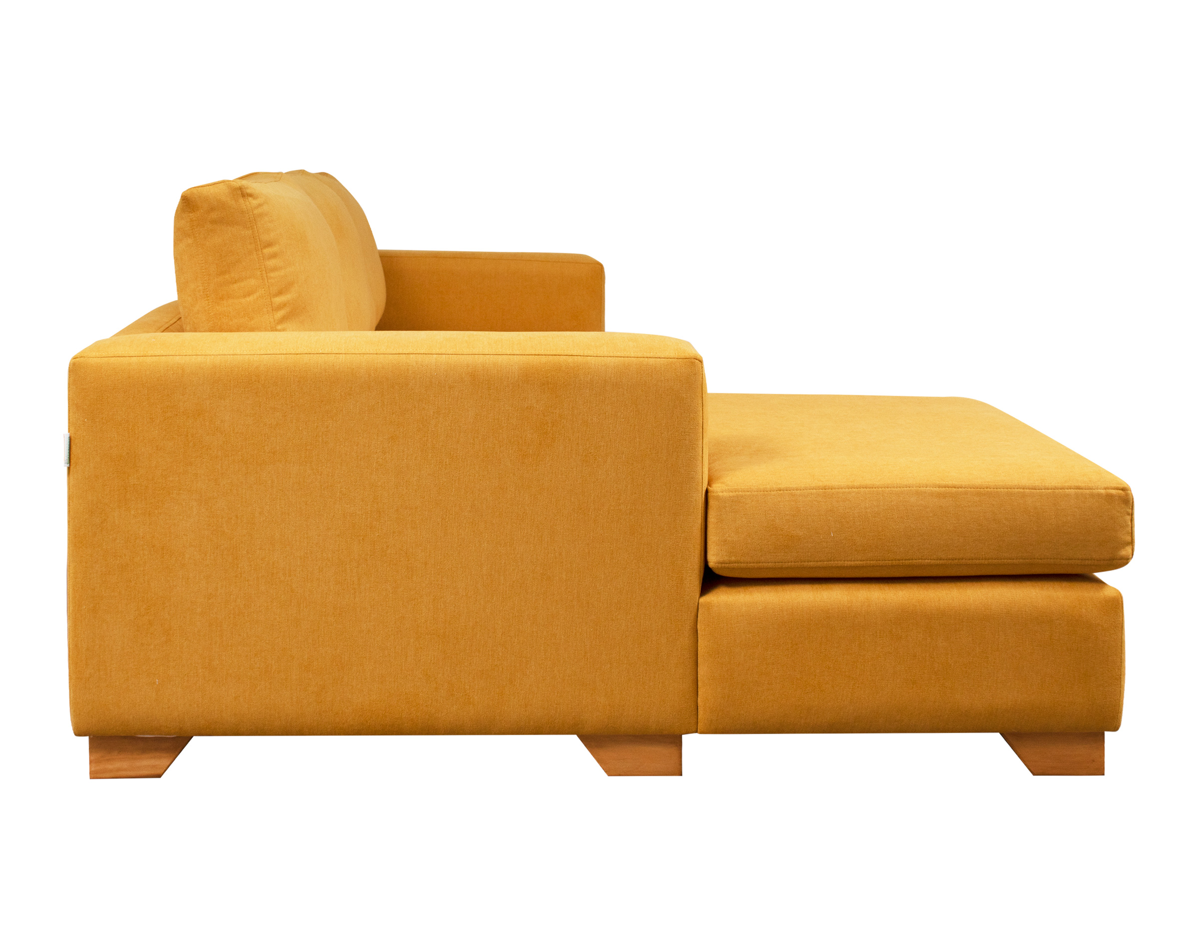 Imagen principal corresponde a Seccional Mónaco chaise longue izquierdo tapiz Dresde color oro con patas de madera color miel corte ángulo.