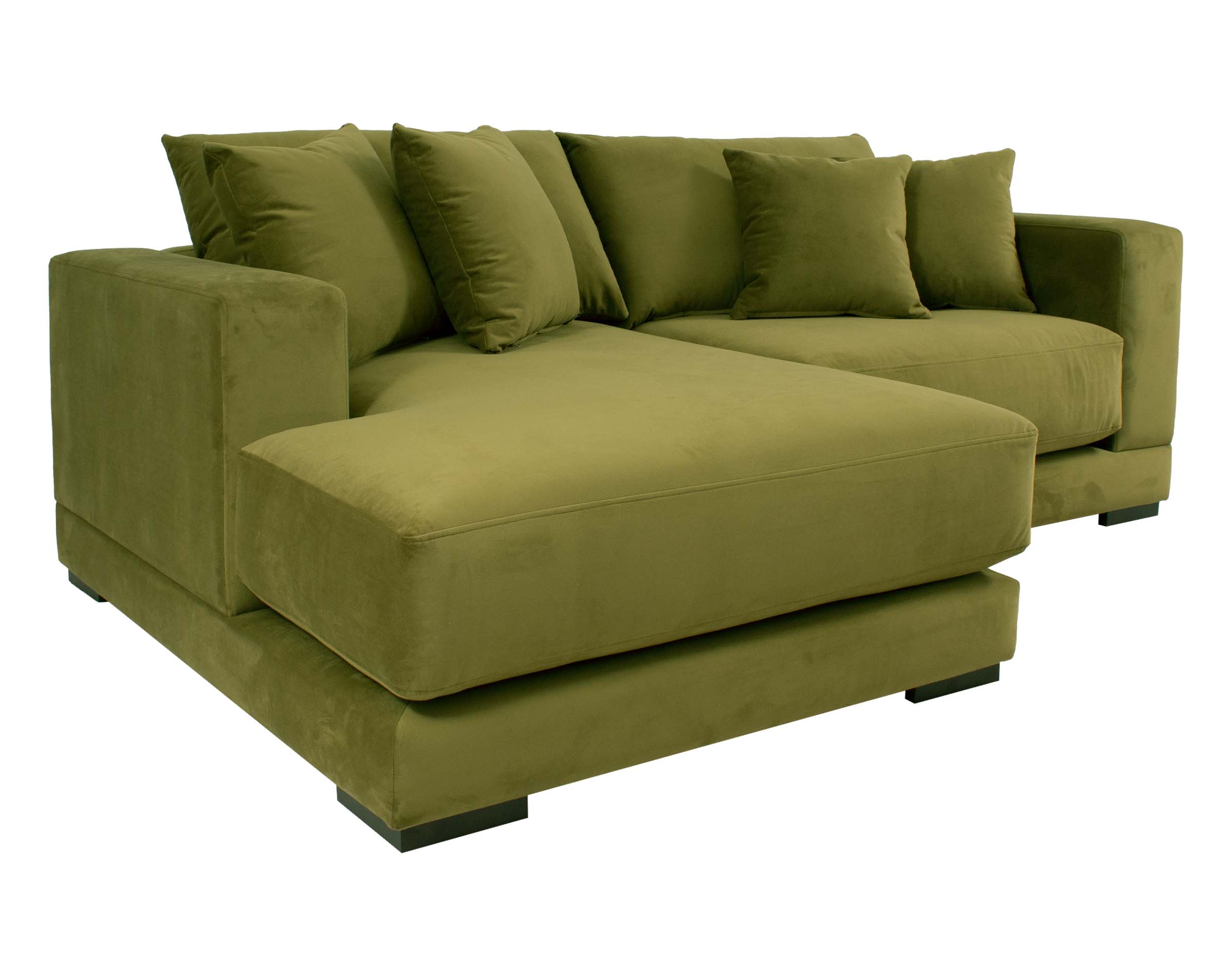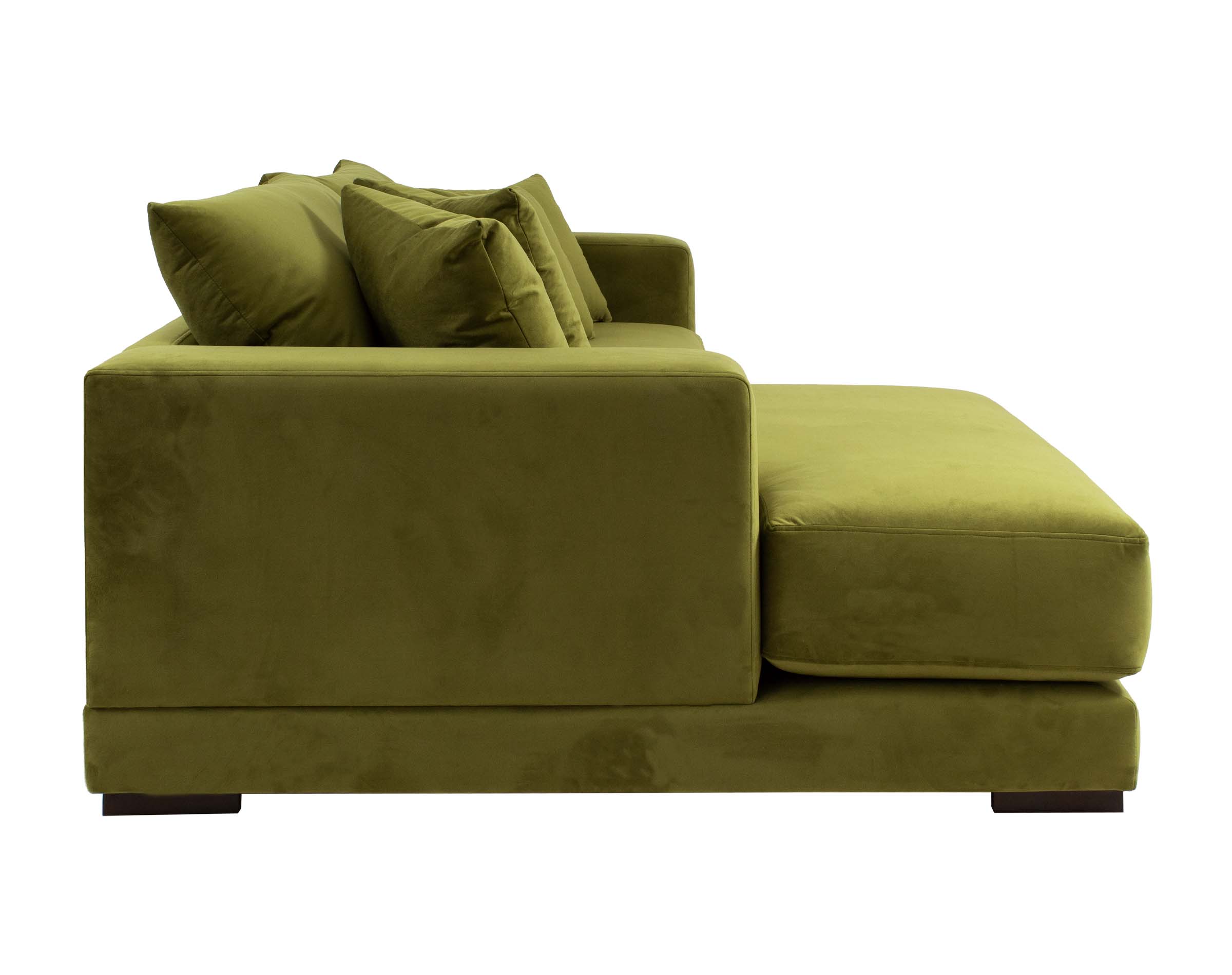 Imagen principal corresponde a Sofá Seccional Nubo chaise longue izquierdo tapiz Felpa Velluti color verde oliva y patas de madera importada ébano 4 cm.