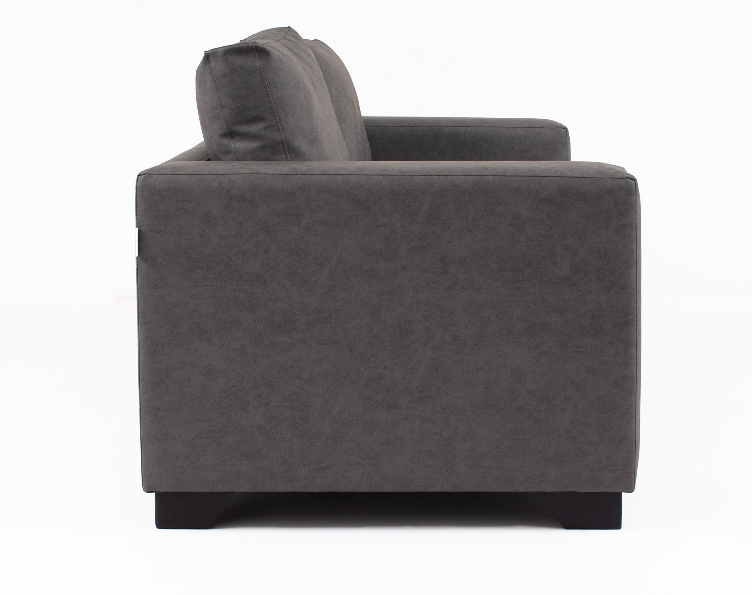 La imagen principal corresponde a Sofá Mónaco 2 Cuerpos tapiz cuero sintético terra pro color grafito y patas de madera color chocolate corte ángulo.