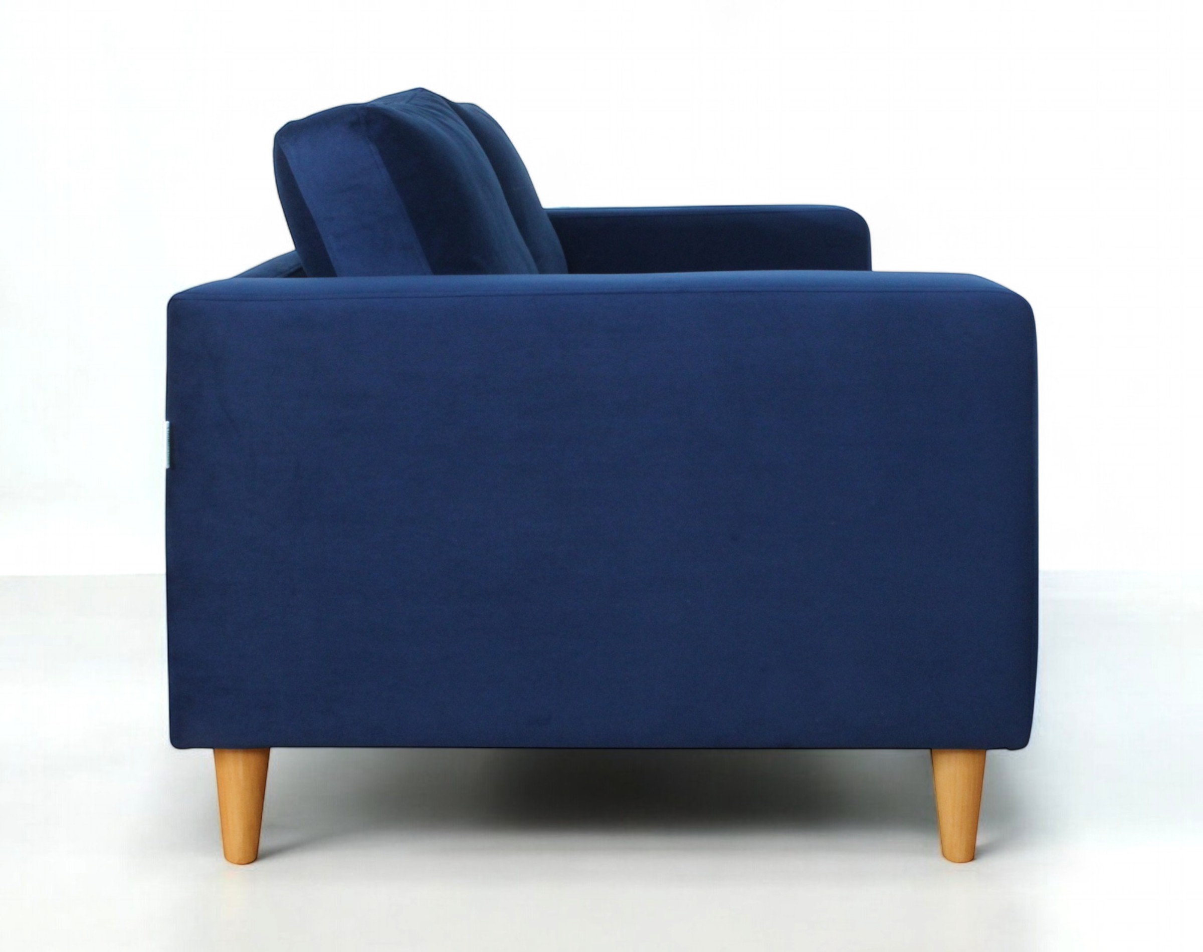 La imagen principal corresponde a Sofá 2 Cuerpos modelo Tai tapiz Felpa Art color azul y patas de madera cónicas color miel.