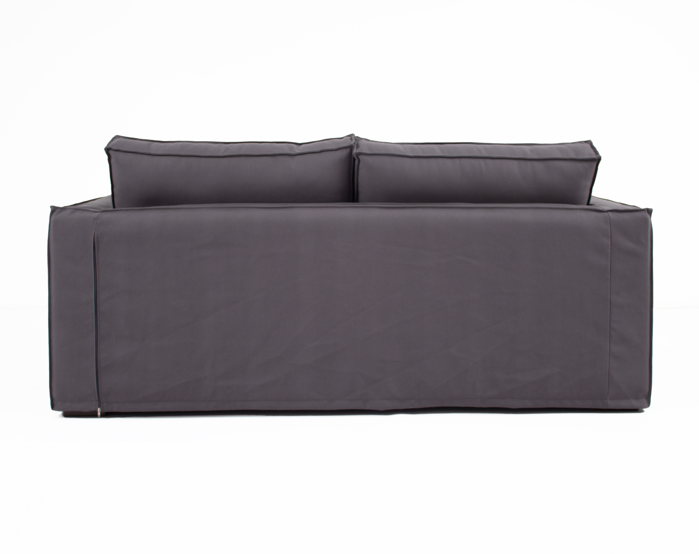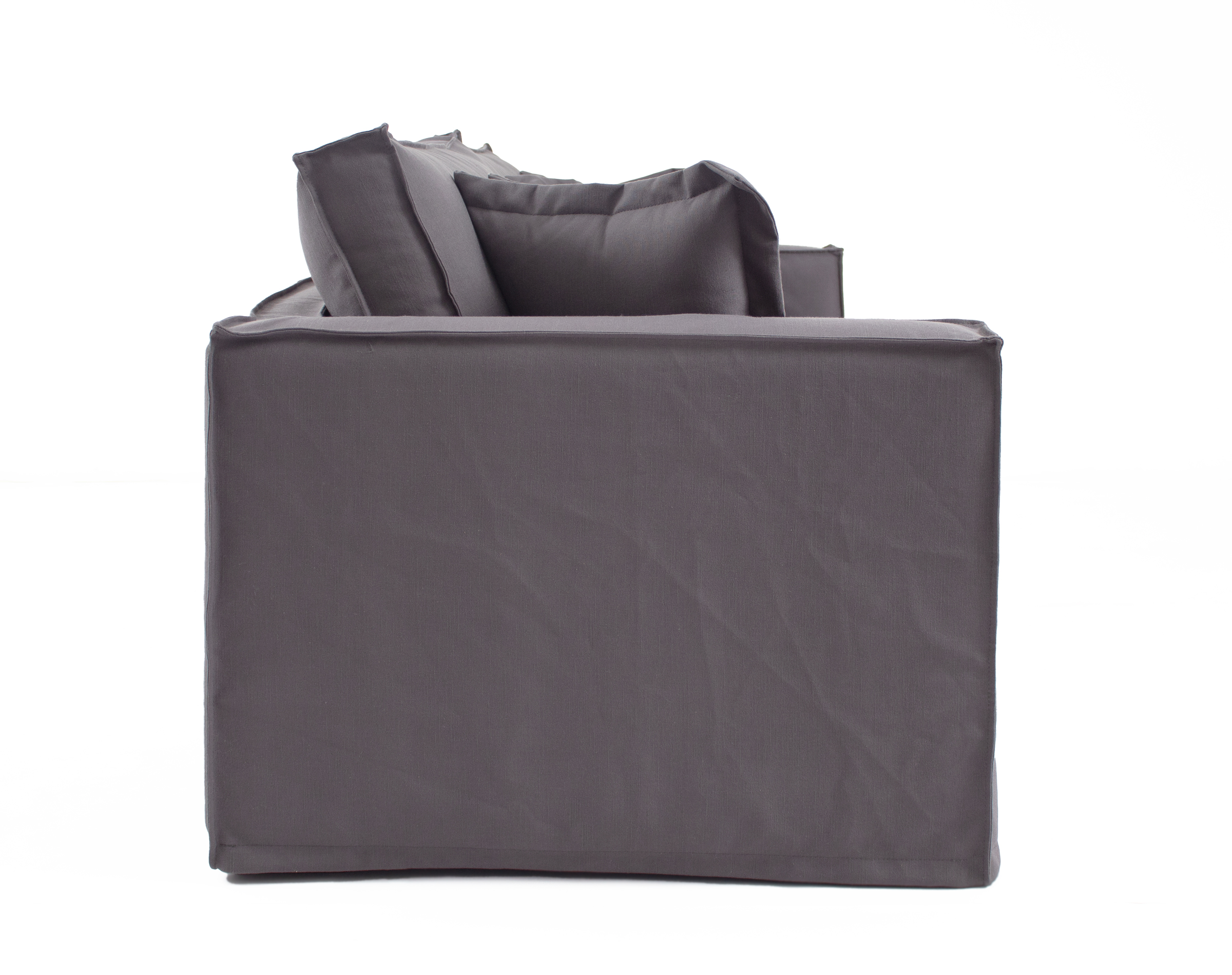 Cuando se usa sin la funda, el sofá presenta amplios cojines de asiento que invitan a la relajación, complementados por cojines de respaldo decorativos que añaden un toque de estilo. Al añadir la funda, el sofá adquiere un diseño elegante con costuras rústicas y gruesas que realzan su estructura, y la funda casi llega al suelo, creando una apariencia pulcra y uniforme.