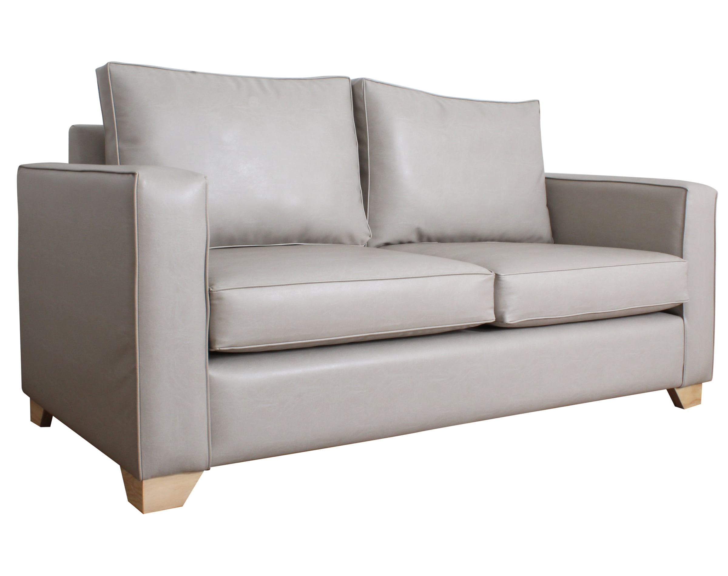 Sofá Henry 3 cuerpos tapiz Cuero Sintético Master Best color Gelo, costura perimetral cojines y parte frontal brazo con vivo o cordón cosido con Pata madera 7 cm color natural corte ángulo.