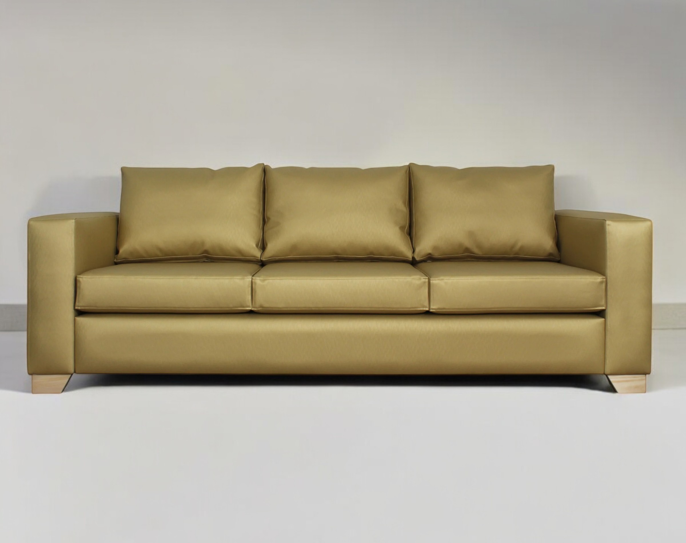 Sofá modelo Mónaco 3 cuerpos tapiz PU chester con Pata madera 7 cm natural corte ángulo.