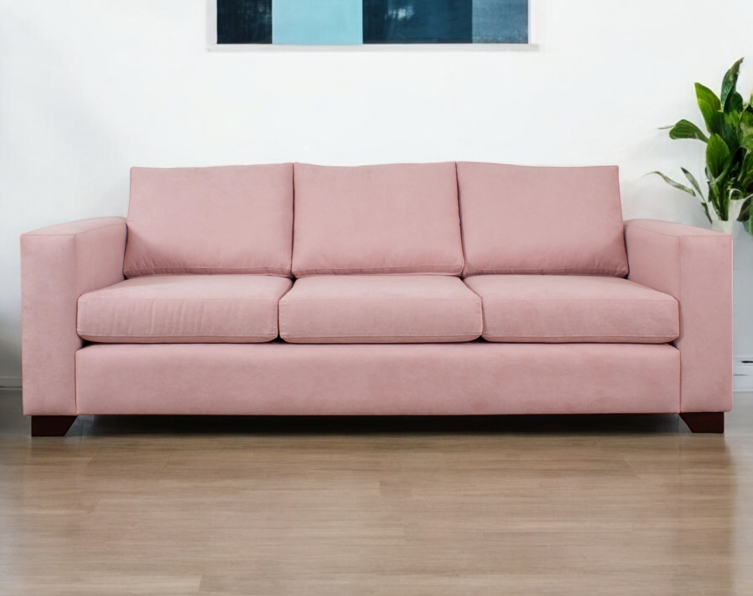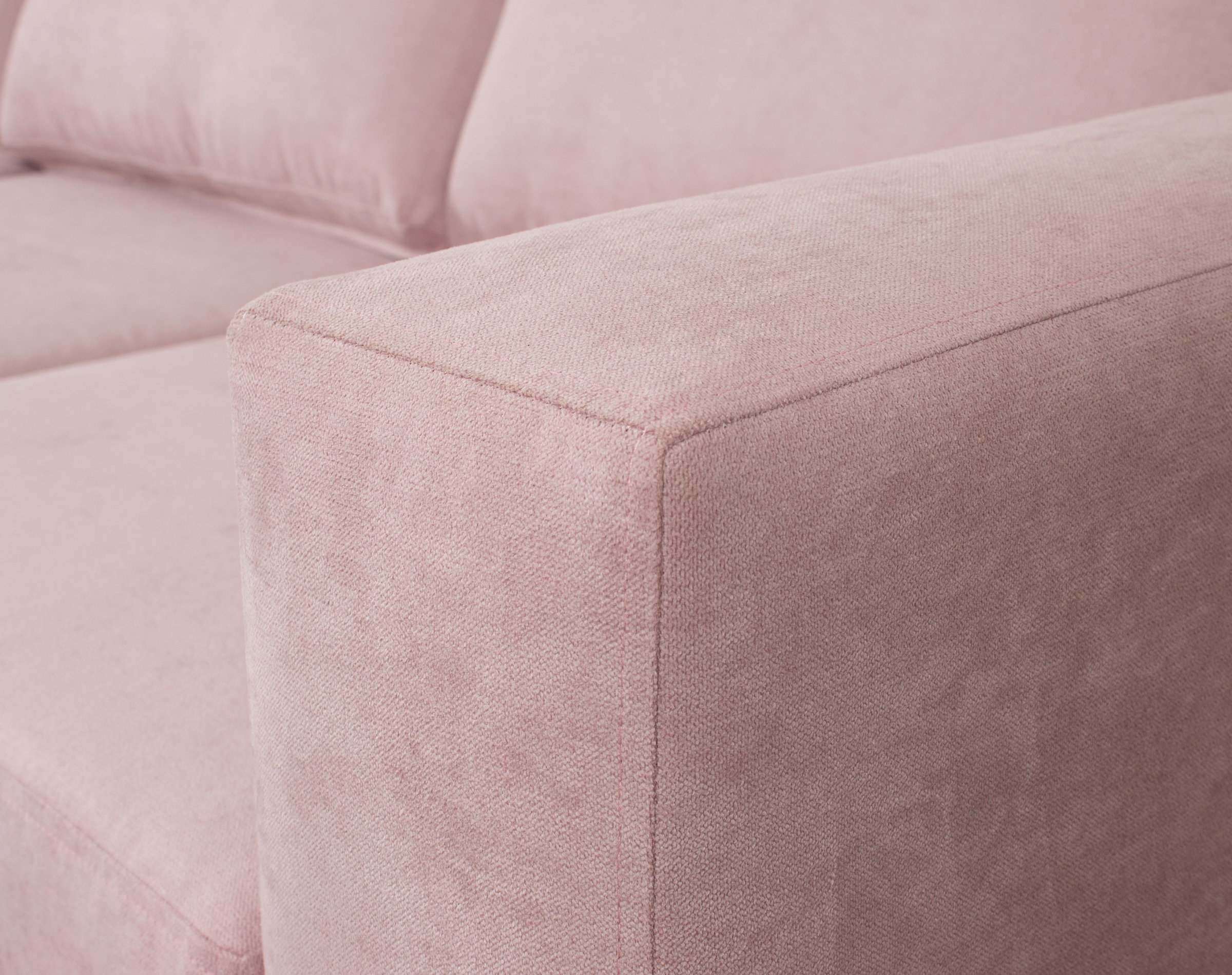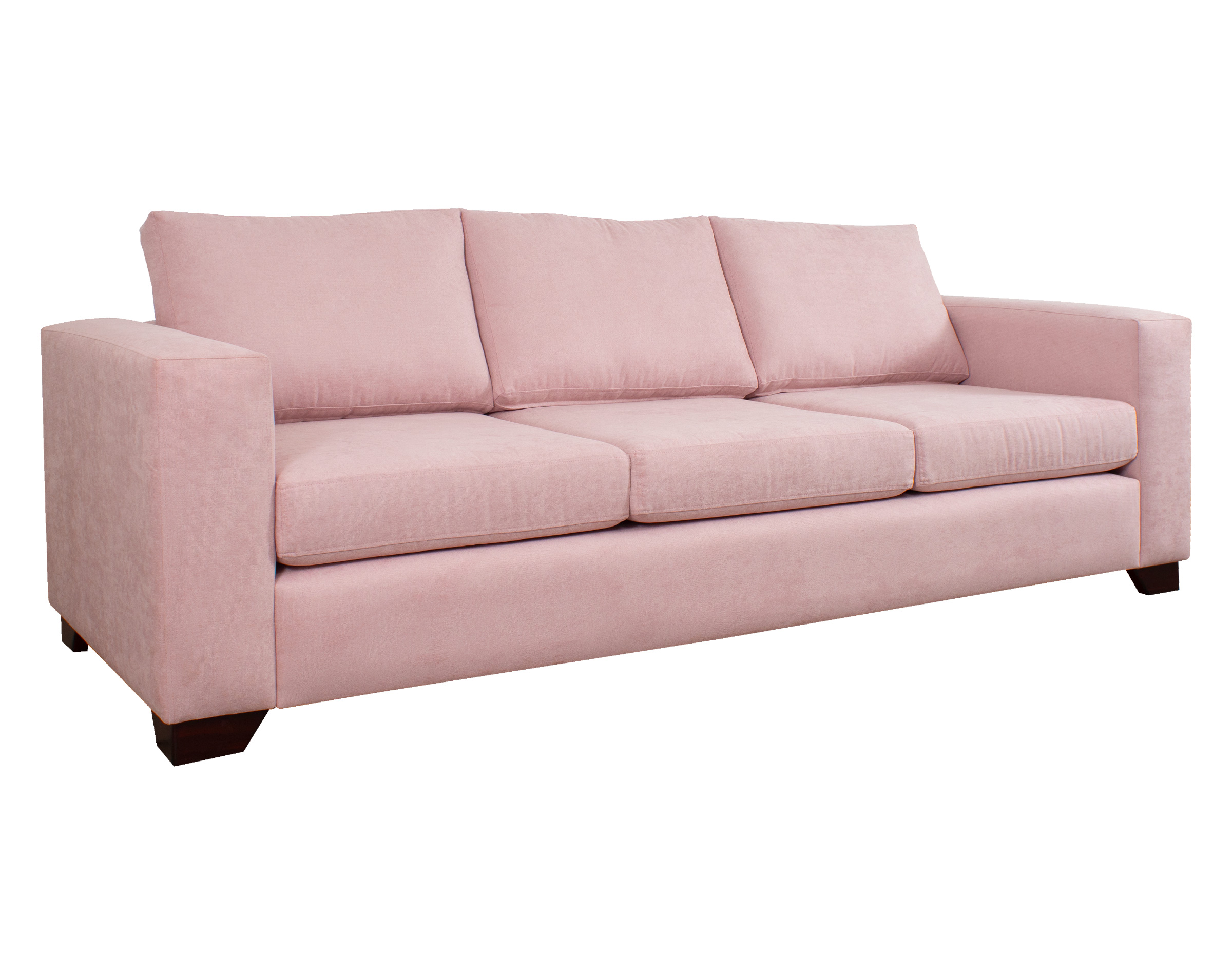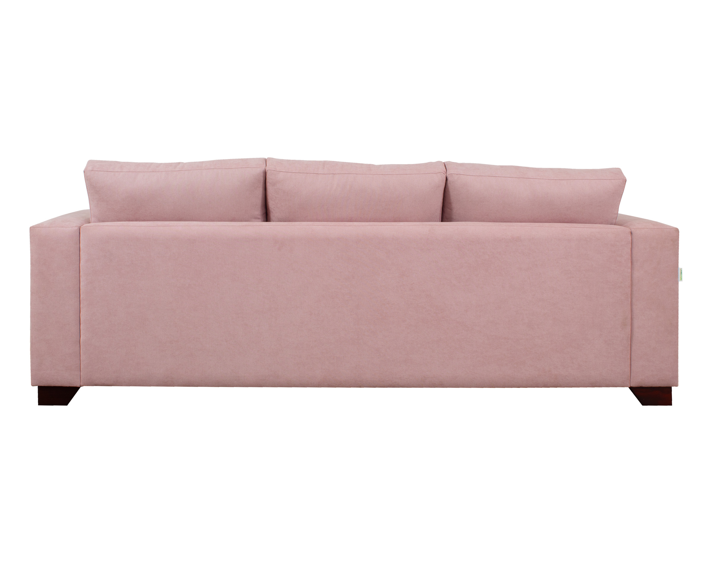 Imagen principal corresponde a Sofá 3 Cuerpos Mónaco Soro color palo rosa y patas de madera color chocolate corte ángulo altura 7 cm.