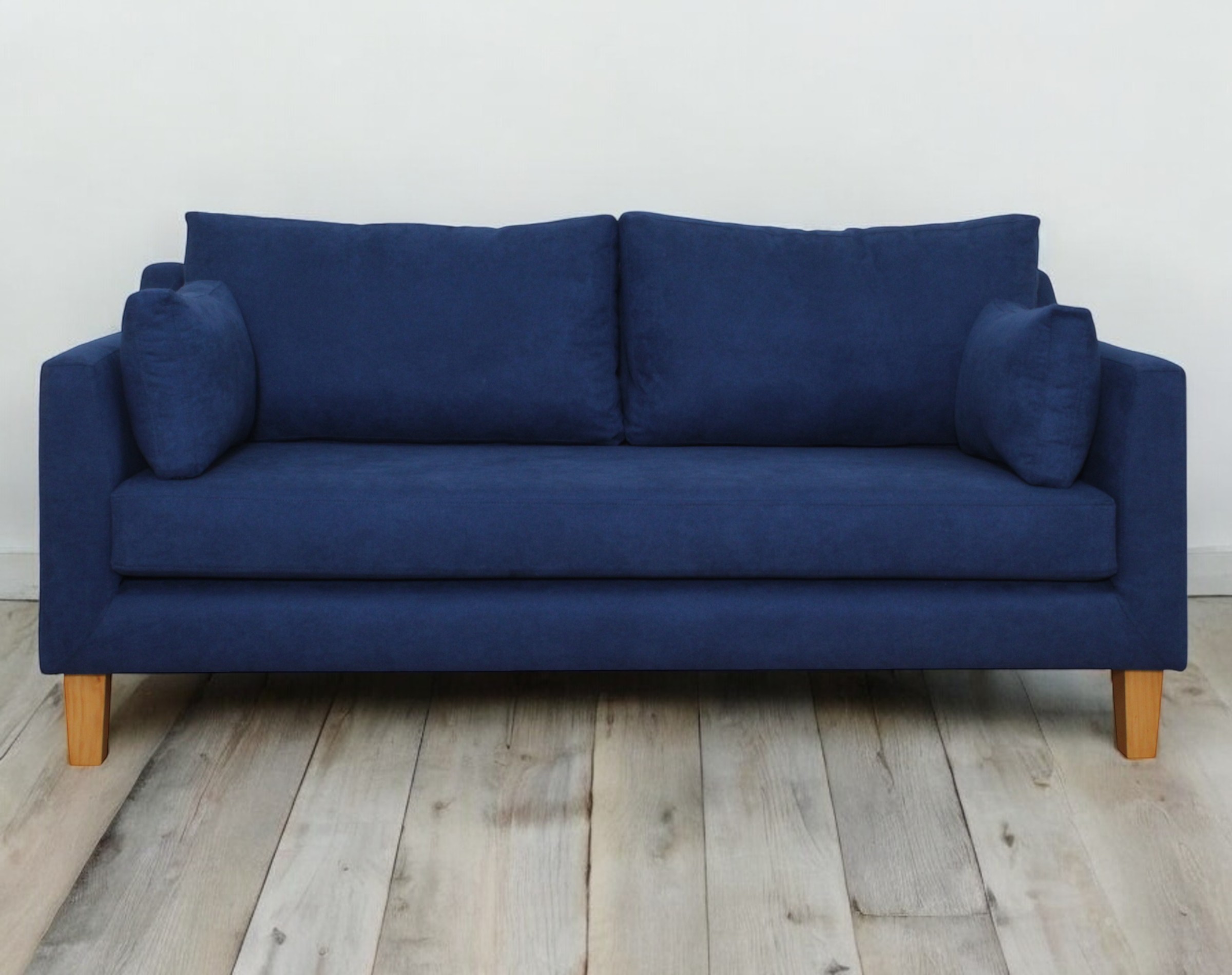 Fotografía corresponde a Sofá 2 cuerpos modelo Nápoles tapizado en tela VV 27 color azul y patas de madera biseladas color miel.