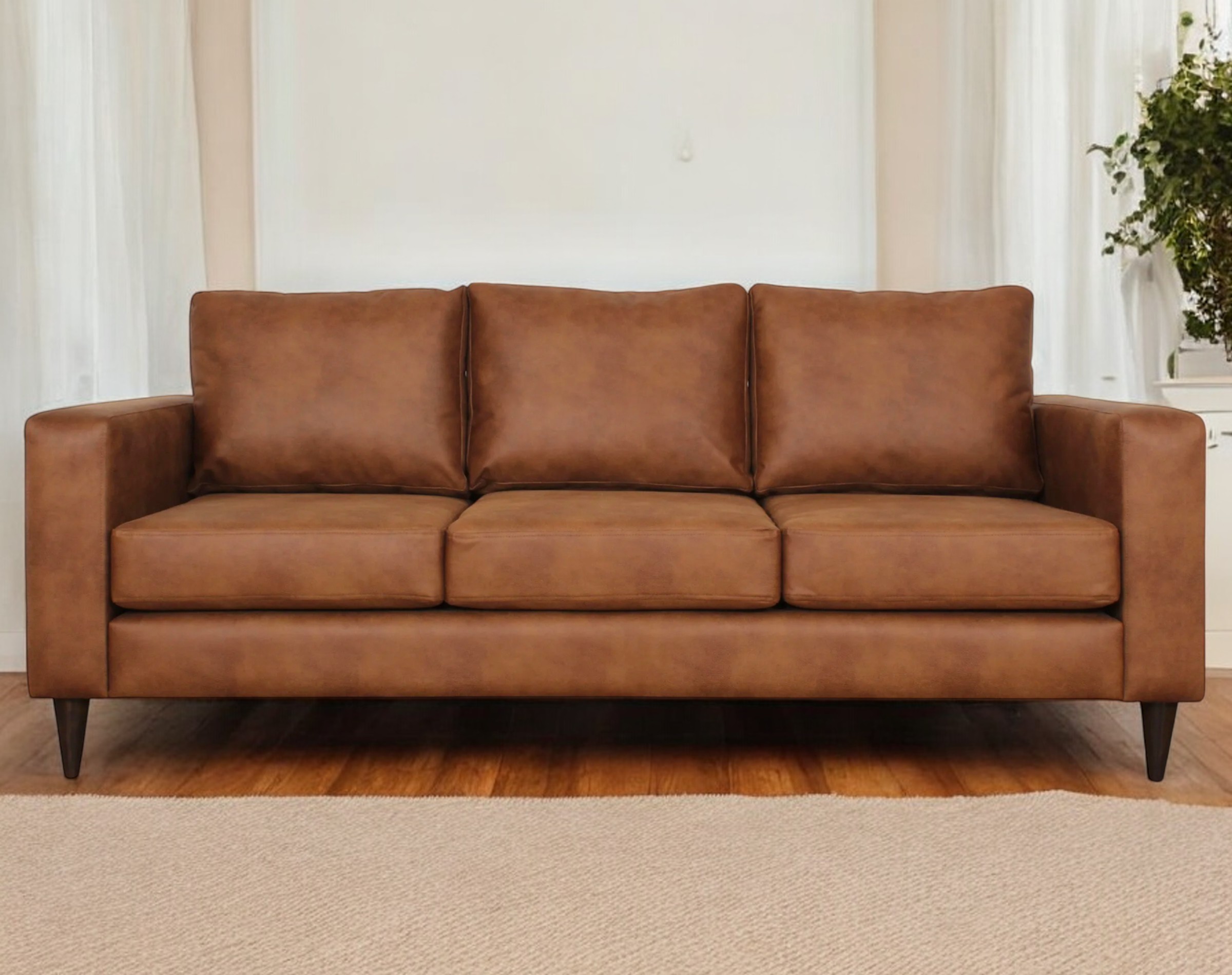 Sofá Tai 3 cuerpos tapiz cuero bonded 70% color Whisky con Pata madera biselada 15 cm color ciprés.
