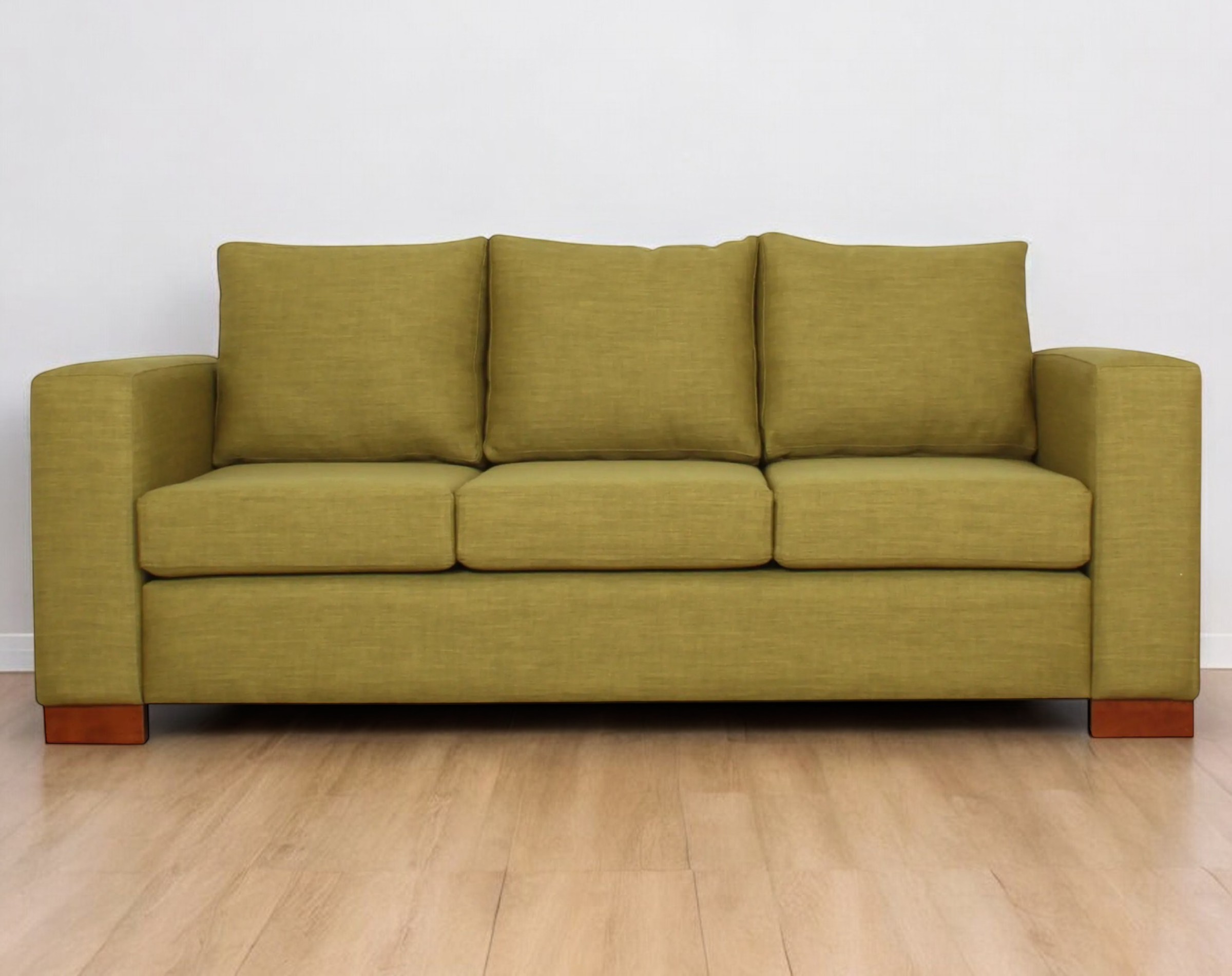 Sofá Thomas 3 cuerpos 3 divisiones de asiento, tapiz Tucumán color verde con Pata madera 7 cm color caoba corte recto.