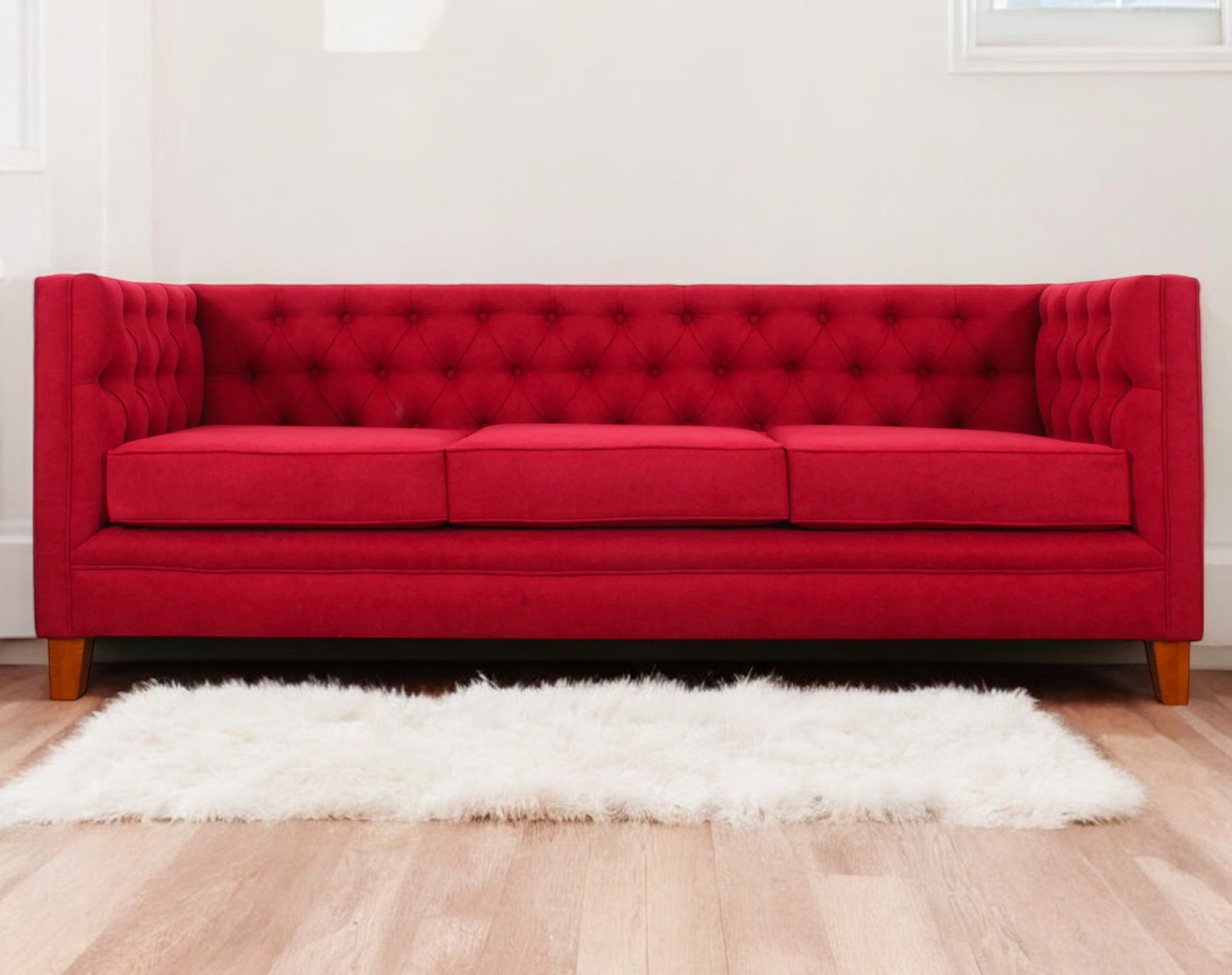 Este sofá está tapizado mediante la técnica capitoné, un procedimiento que consiste en tensar un hilo resistente desde la tela por sobre la espuma hasta que esta se aplaste, dando forma a rombos ordenados a cierta distancia. Luego, se aseguran con un botón forrado para darle más personalidad a su presentación. Para cojines de asiento y cordón vivo se refuerzan las uniones de piezas con costura reforzada.