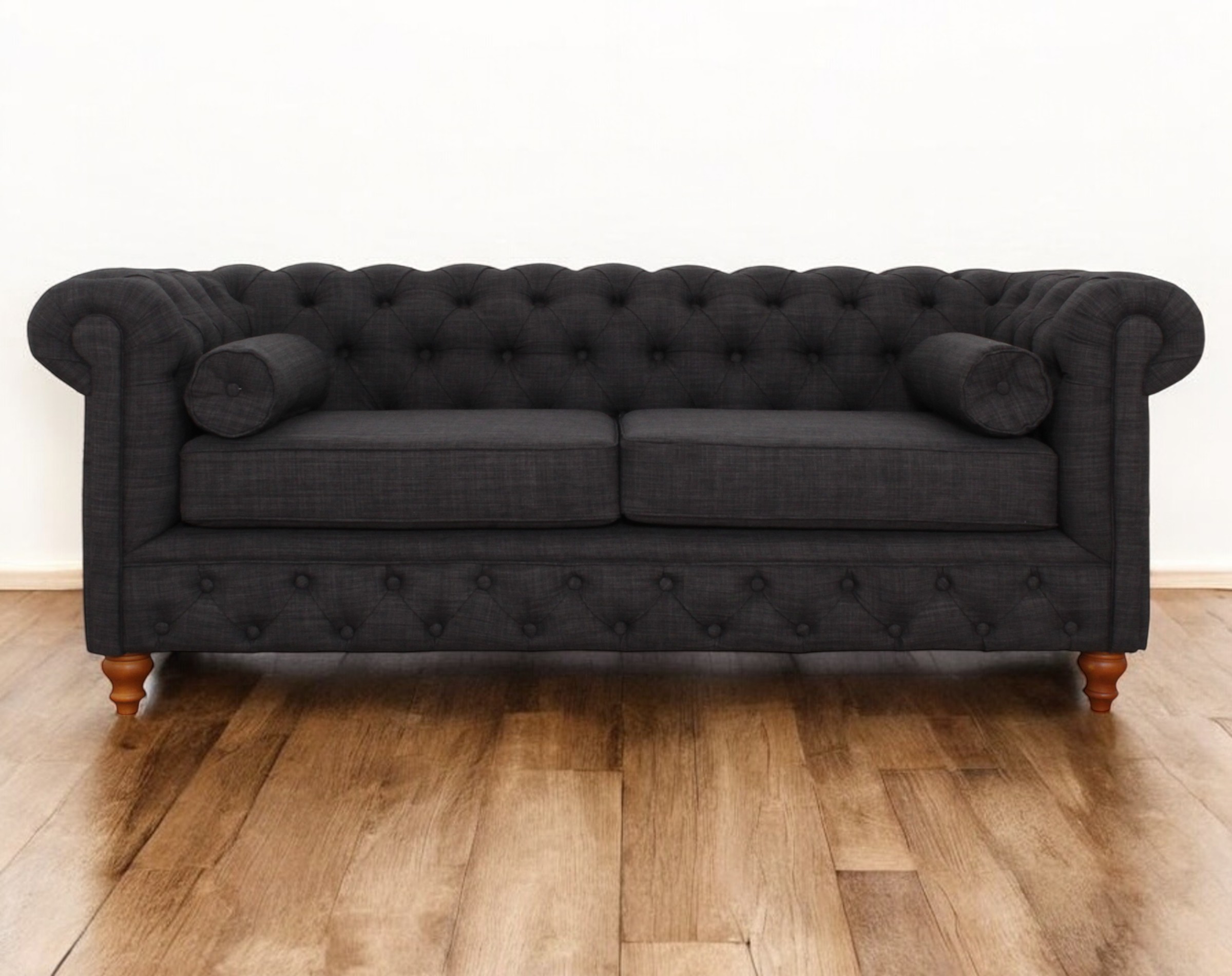 Sofá modelo Chesterfield tapiz alto tráfico Bariloche confeccionado mediante técnica capitoné, costura perimetral asientos y detalle frontal con vivo o cordón cosido con Patas de madera torneada 8 o 12 cm color a elección.