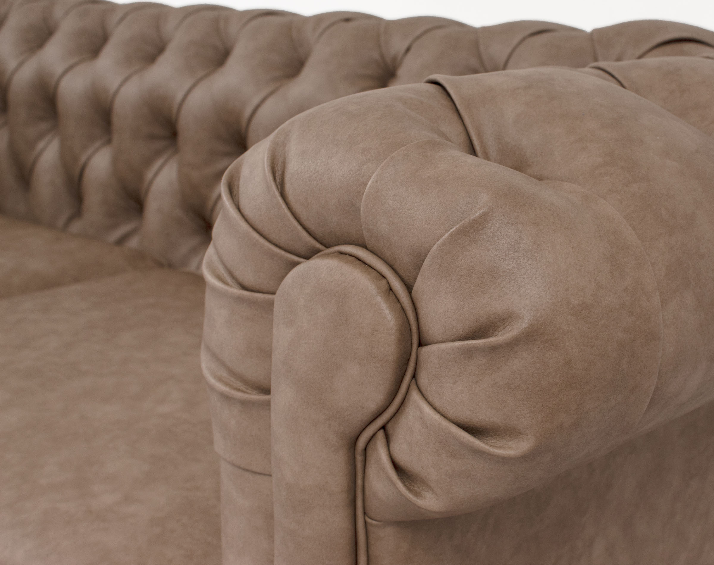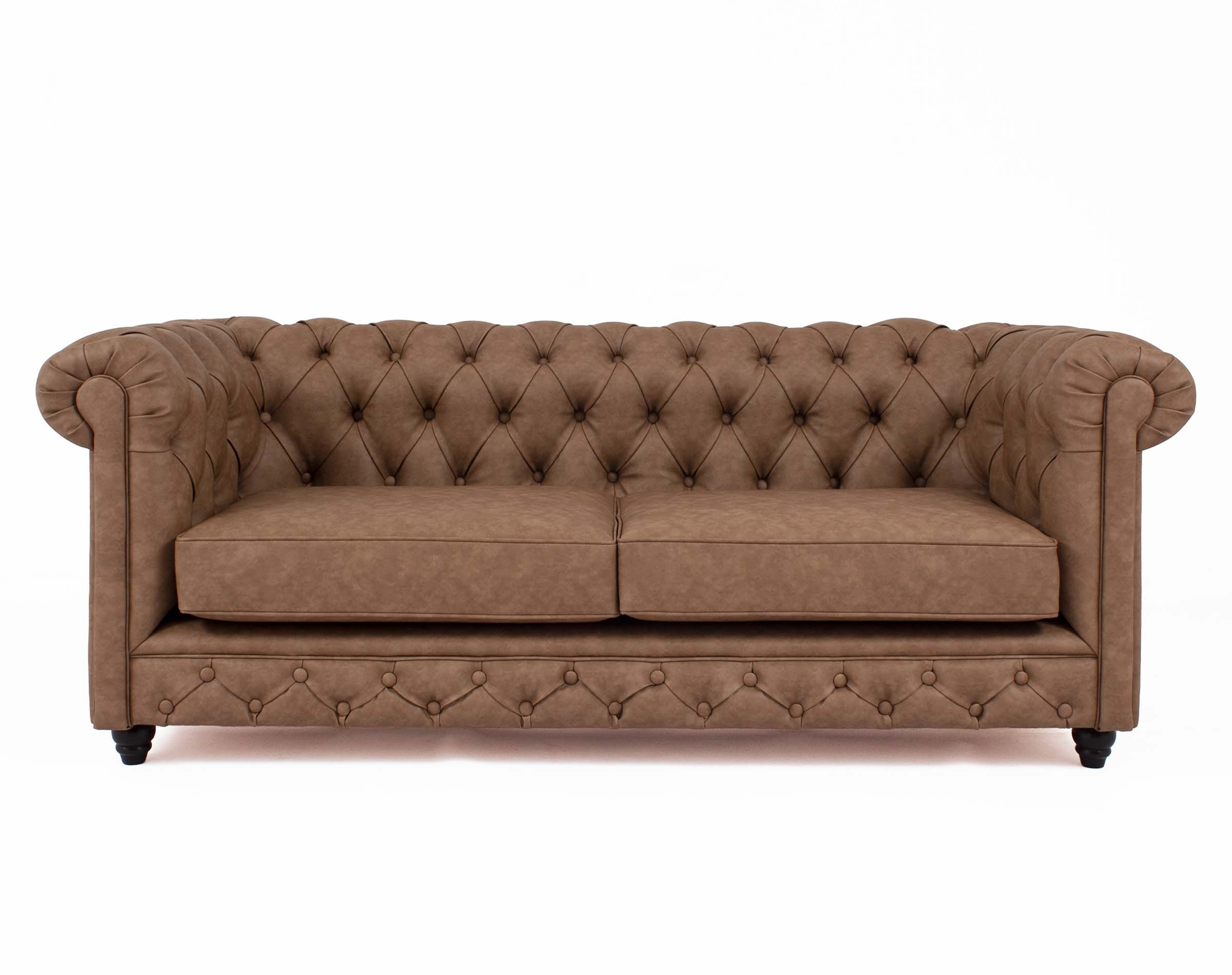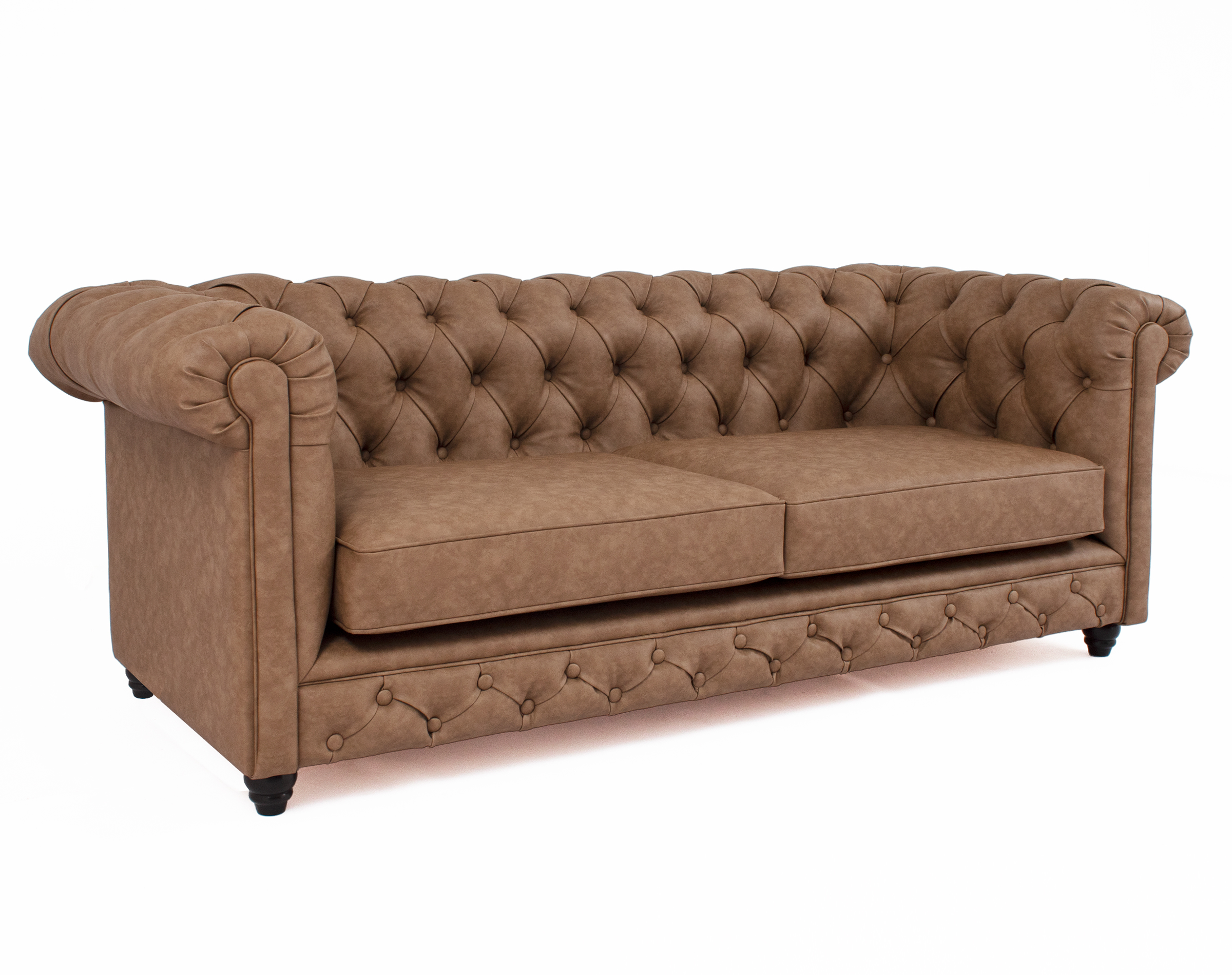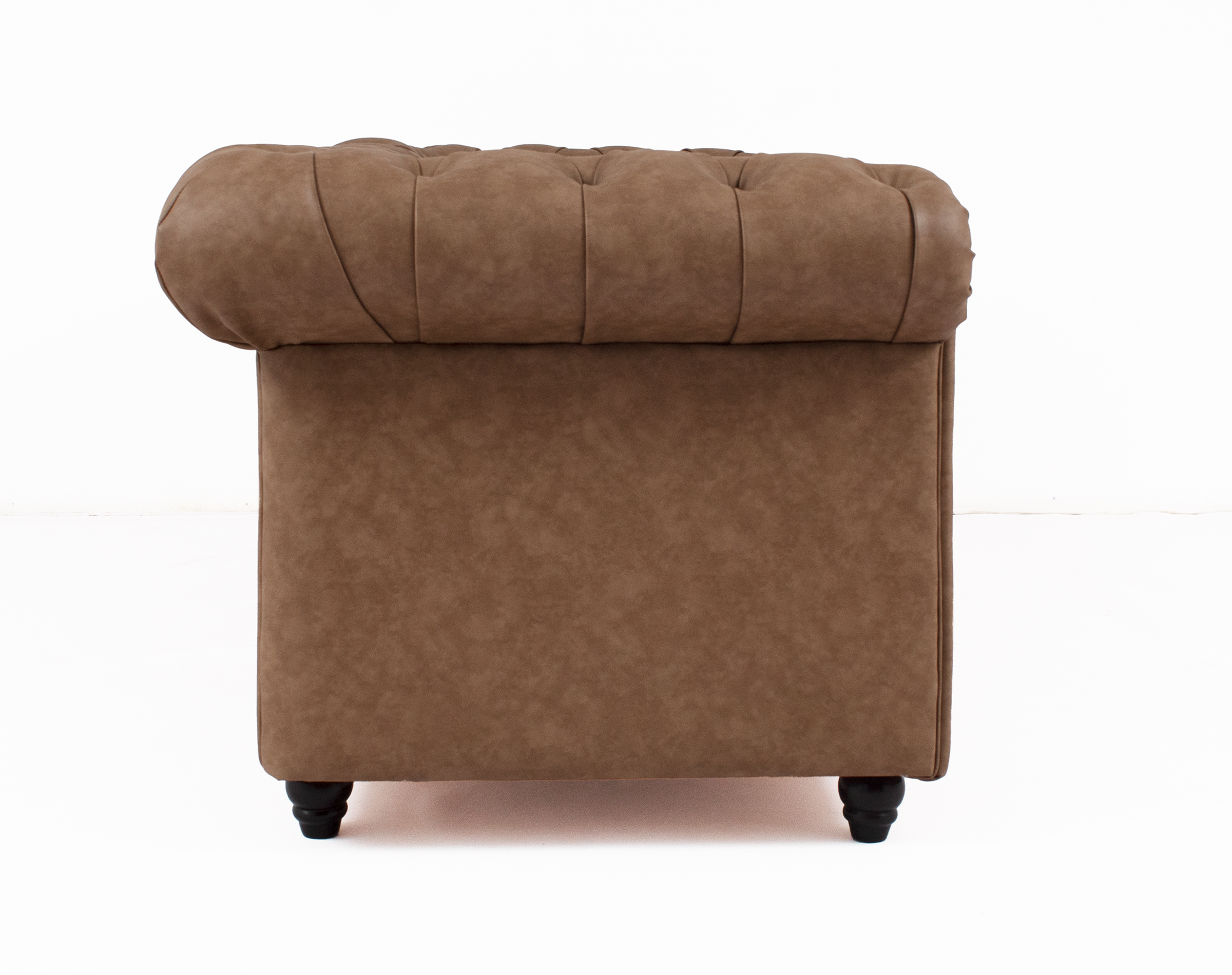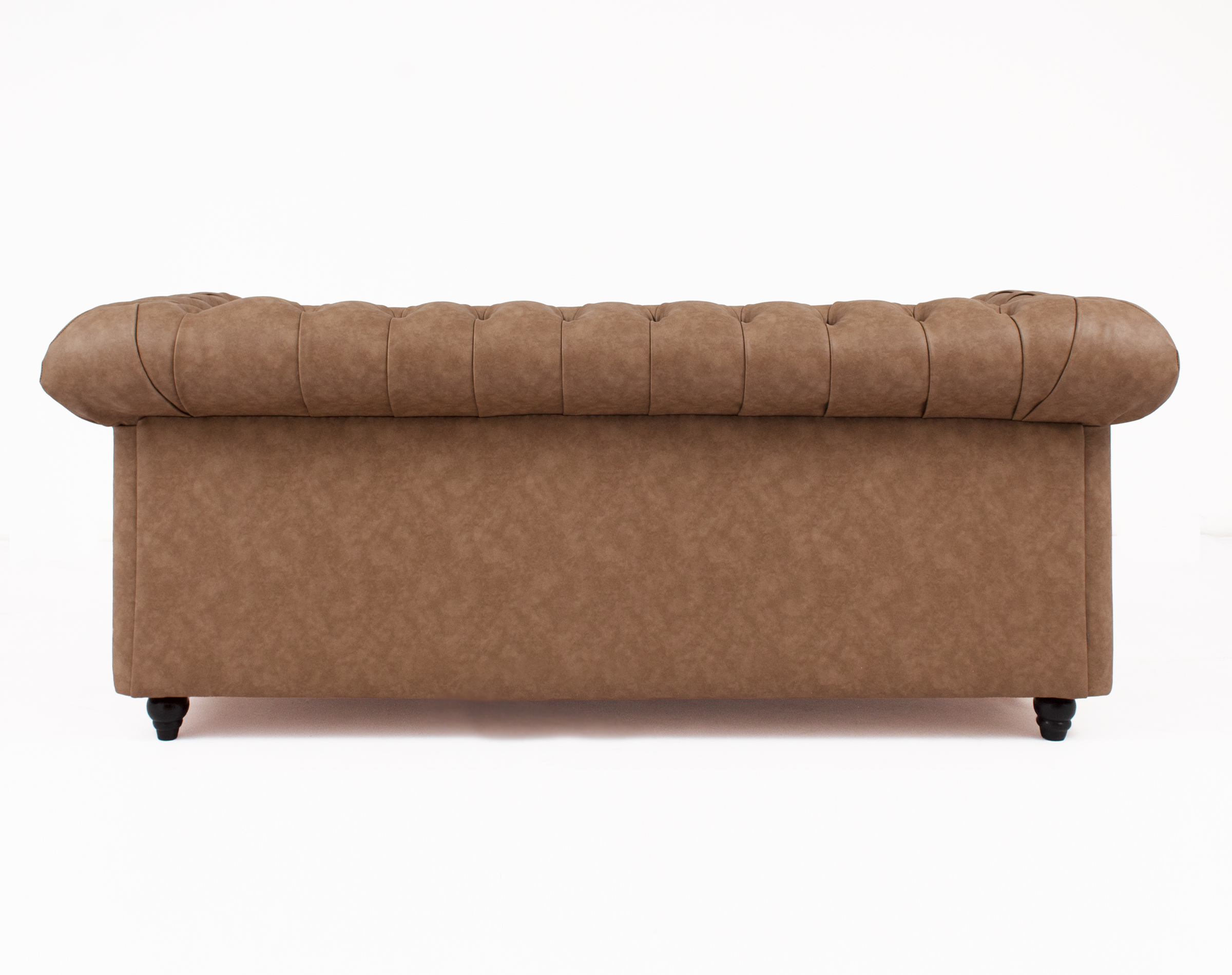 El modelo de la fotografía corresponde a sofá Chesterfield 3 cuerpos tapiz Cuero Sintético Motion color Capuccino y patas de madera torneada color café altura 8 cm.