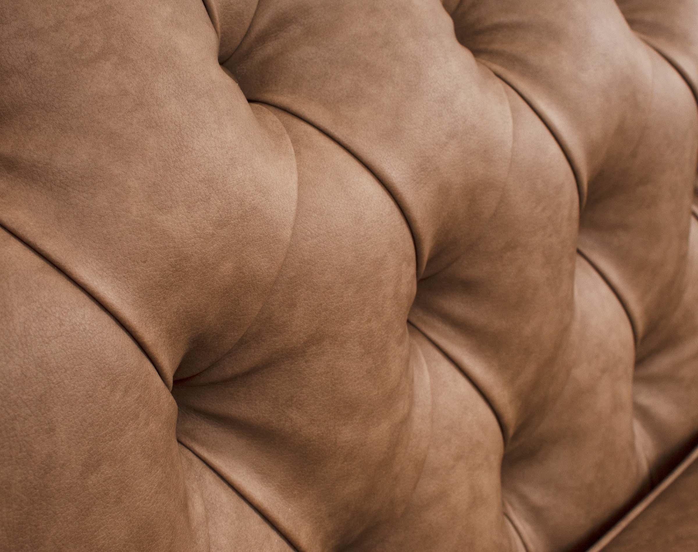 Este sofá está tapizado mediante la técnica capitoné, un procedimiento que consiste en tensar un hilo resistente desde la tela por sobre la espuma hasta que esta se aplaste, dando forma a rombos ordenados a cierta distancia. Luego, se aseguran con un botón forrado para darle más personalidad a su presentación. Para cojines de asiento y cordón vivo se refuerzan las uniones de piezas con costura reforzada.