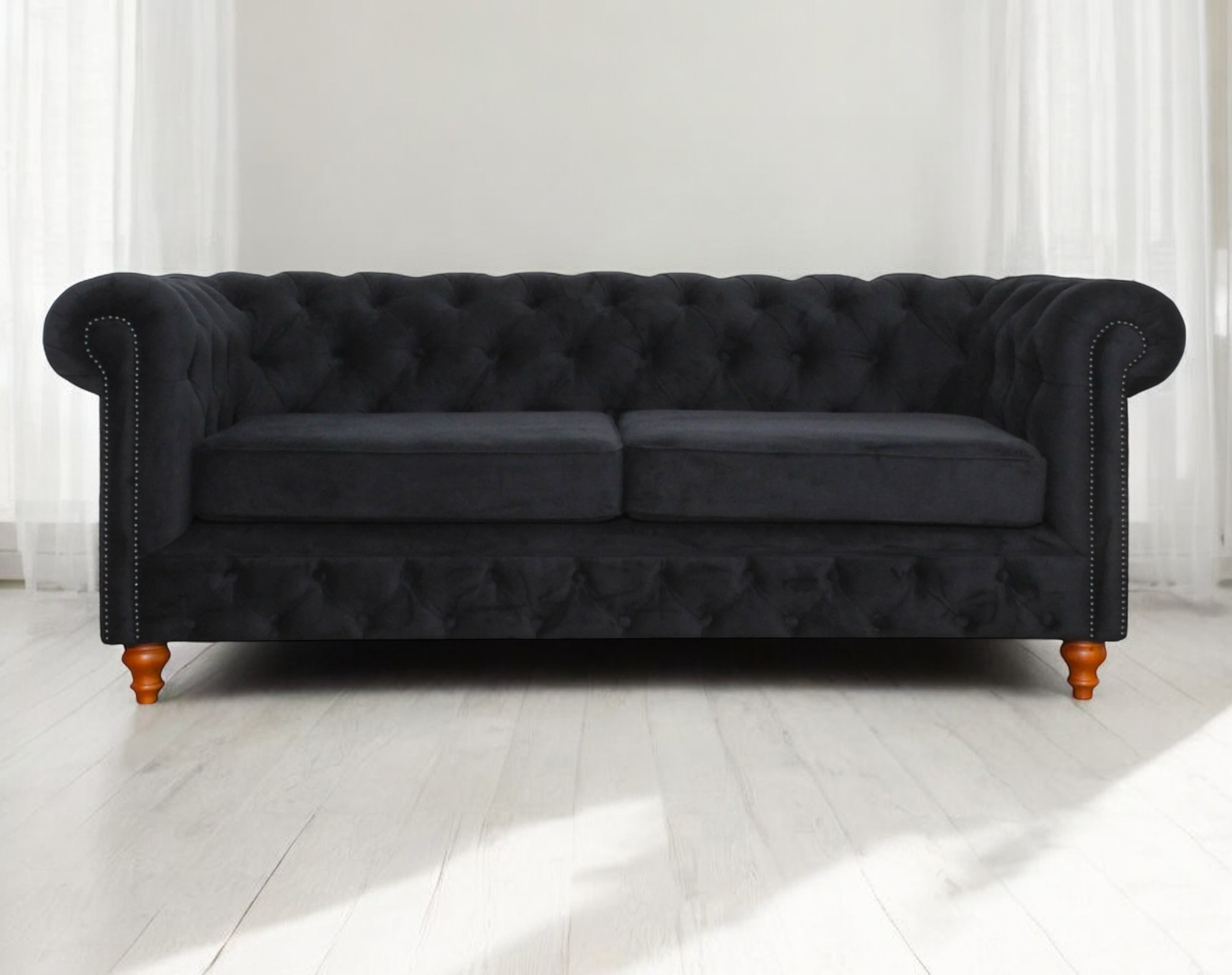 Sofá 3 Cuerpos Chesterfield 200 cm tapiz Felpa Soft Velvet color negro confeccionado mediante técnica capitoné, costura perimetral asientos y detalle frontal con vivo o cordón cosido y clavo tapicero color negro mate en frente de brazos con patas de madera importada 12 cm.